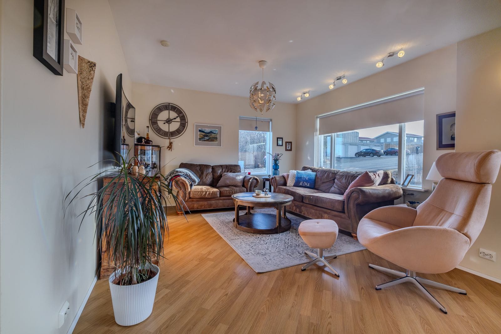 Stór stofa og borðstofa með útengt út á suðursvalir.