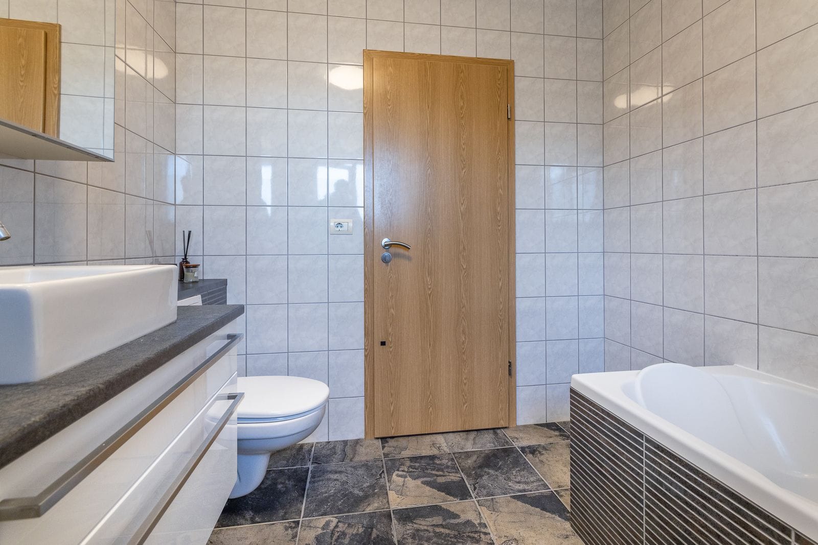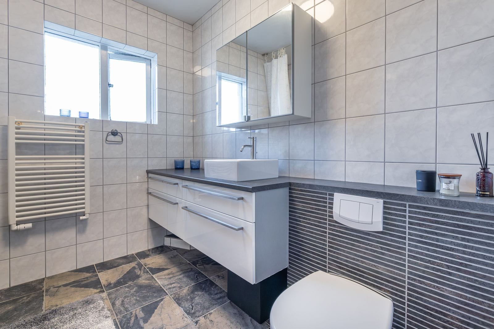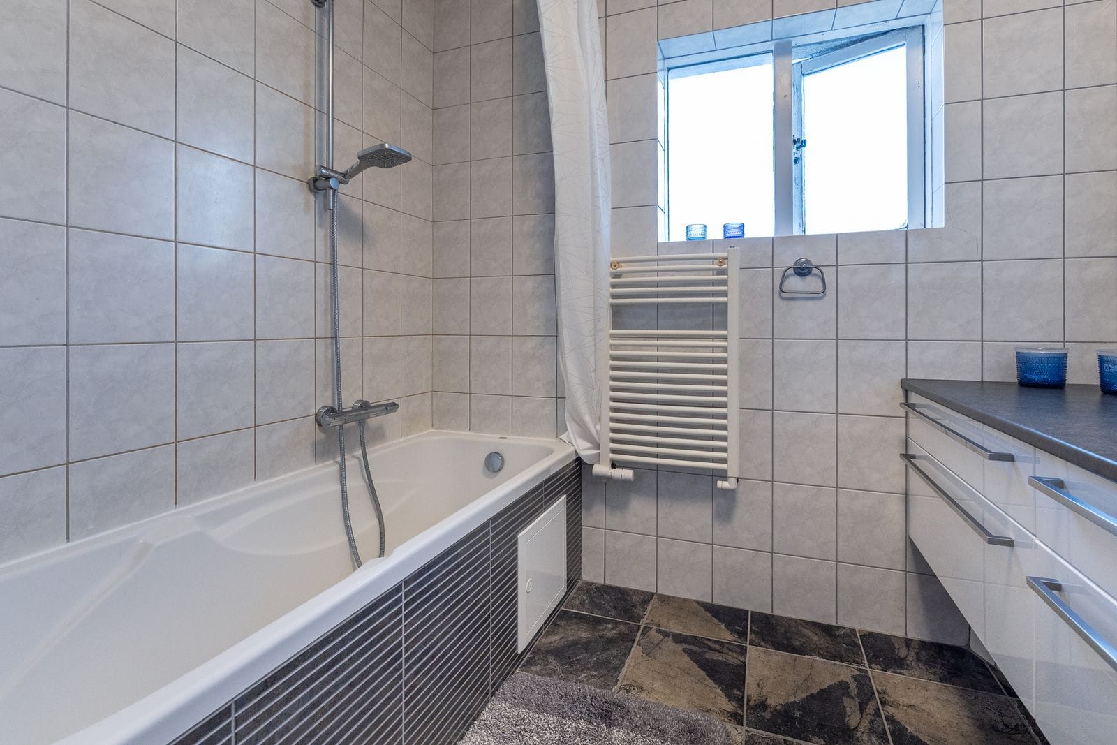 Baðherbergi er flísalagt. Nýleg innrétting og sturtubaðkar Opnanlegur gluggi til vesturs.