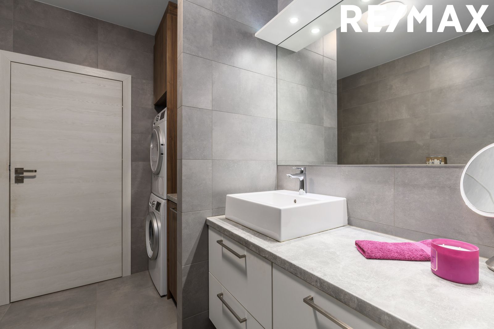Þvottahús aðstaða : er inn á baðherbergi með hnotuspón innréttingu með aðstöðu fyrir þvottavél og þurrkara ásamt samtengdri innréttingu með skolvask og skápum.