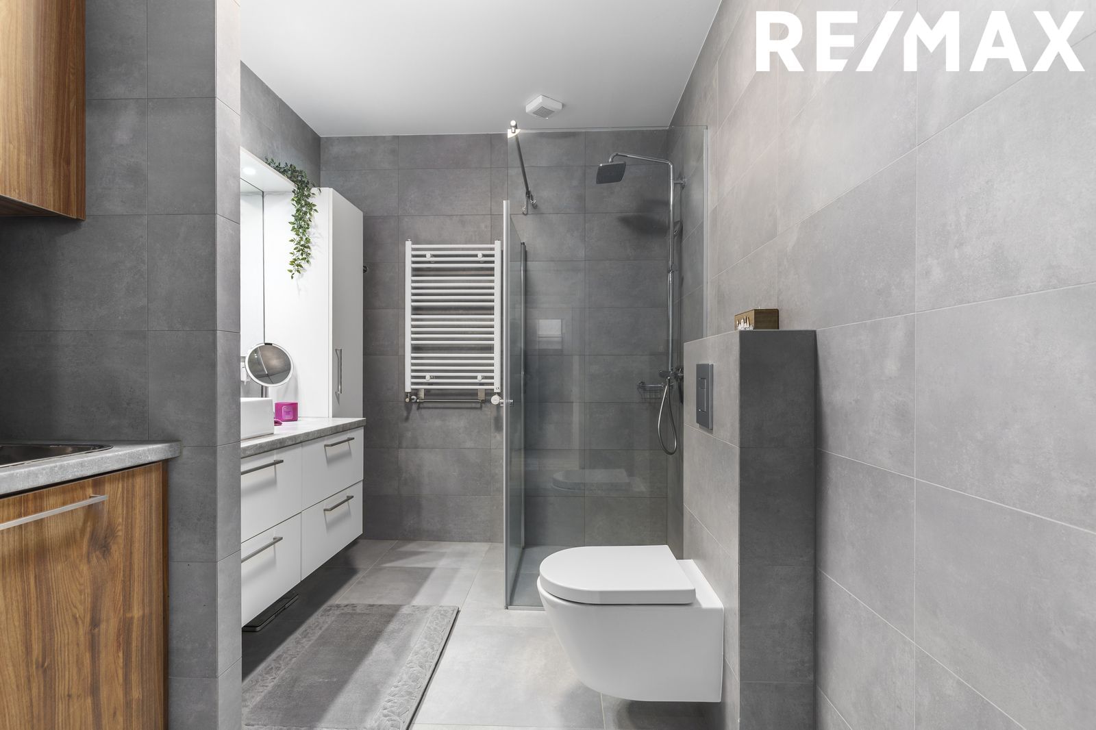 Baðherbergi : er flísalagt í hólf og gólf með vandaðri hvítri baðinnréttingu með vask og spegil ásamt upphengdu salerni, handklæðaofni og sturtu.