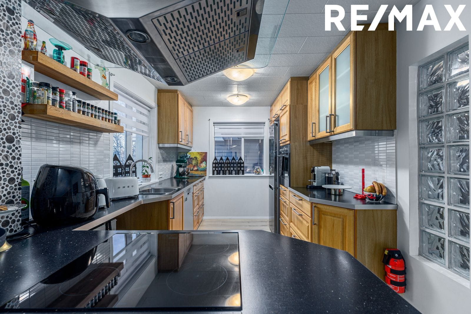 Eldhús: Parket á gólfi. Góð innrétting með spansuðuhelluborði og háfi yfir. Nýlegur bakstsursofn í vinnuhæð. Flísalagt á milli efri og neðri skápa.