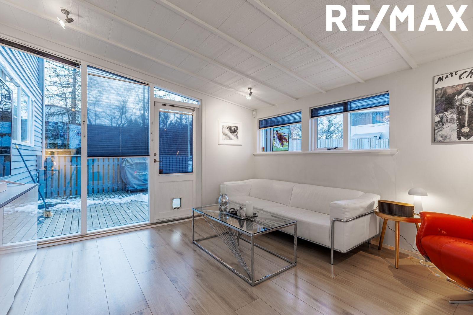 Stofa: Parket á gólfi. Útgengt á baklóð hússins á pall með skjólveggjum sem snýr til suðurs.