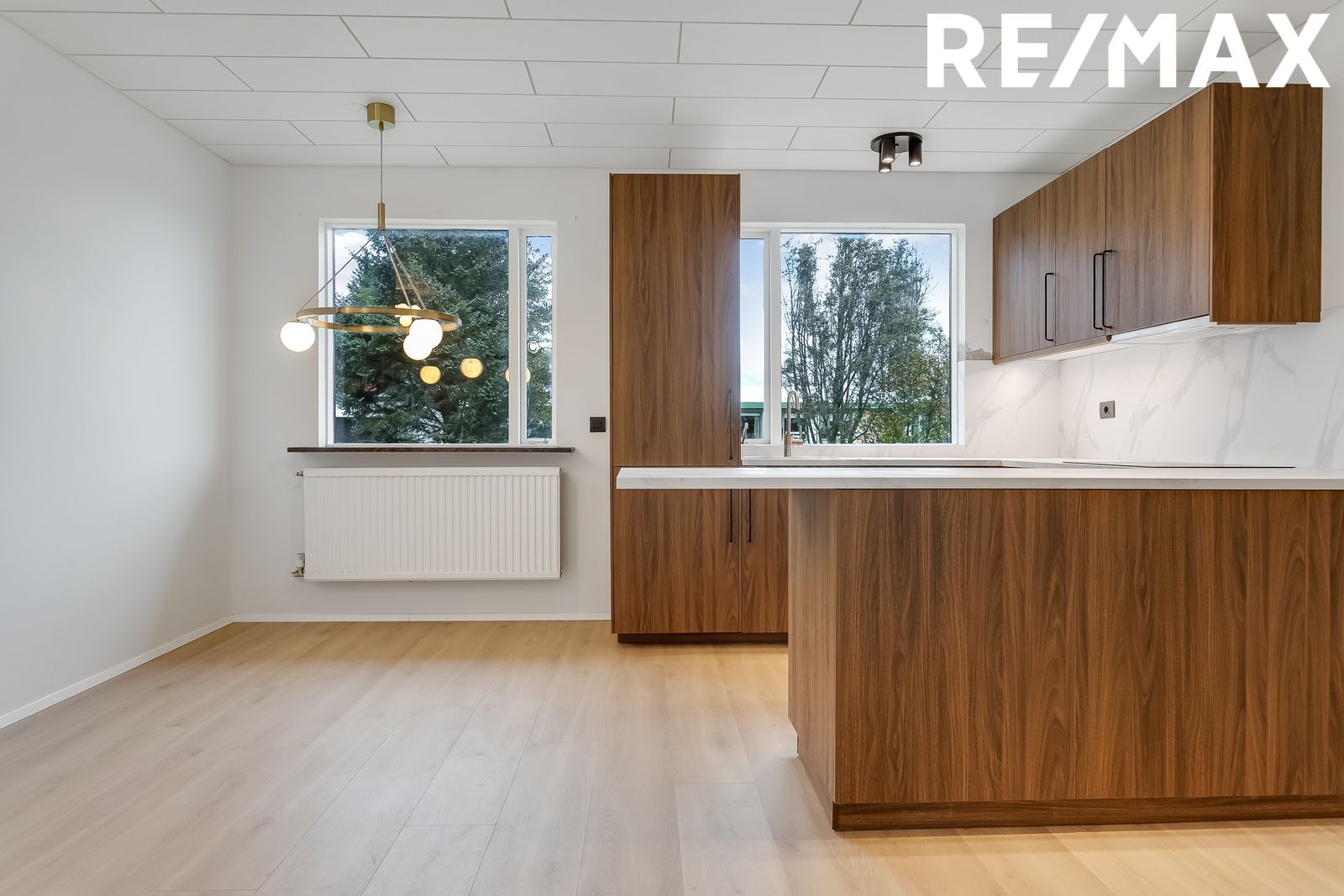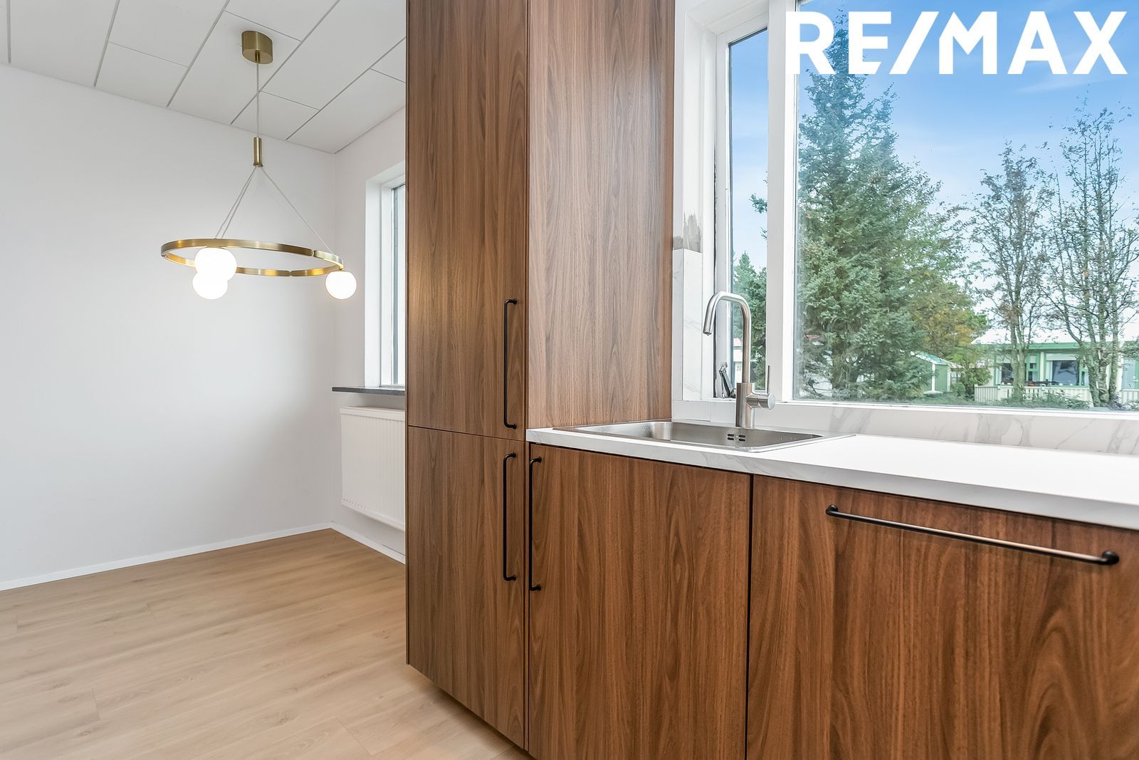 - Ný eldhúsinnrétting ásamt tækjum: Innbyggður ísskápur, innbyggð uppþvottavél, bakaraofn og span helluborð.