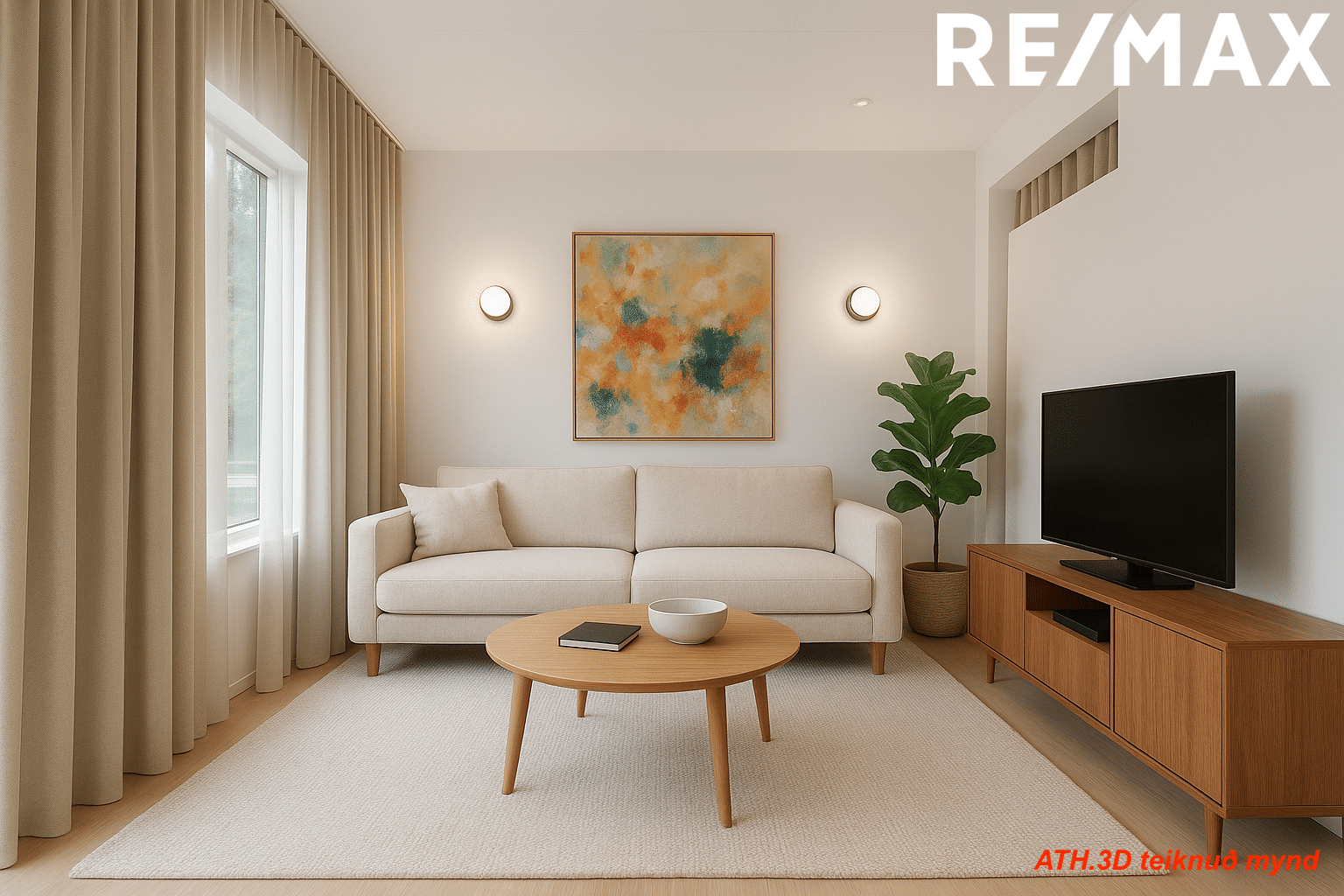 ATH. Myndir í auglýsingu sem sýna innbú voru búnar til með hjálp gervigreindar, það er gert einungis til að gefa hugmyndir að fullbúnu rými, hlutföll og fleiri hlutir geta hliðrast til og ber því að taka þessum myndum með fyrirvara, upprunalegu myndirnar eru einnig til staðar.