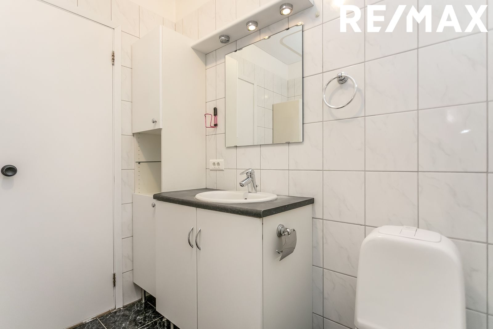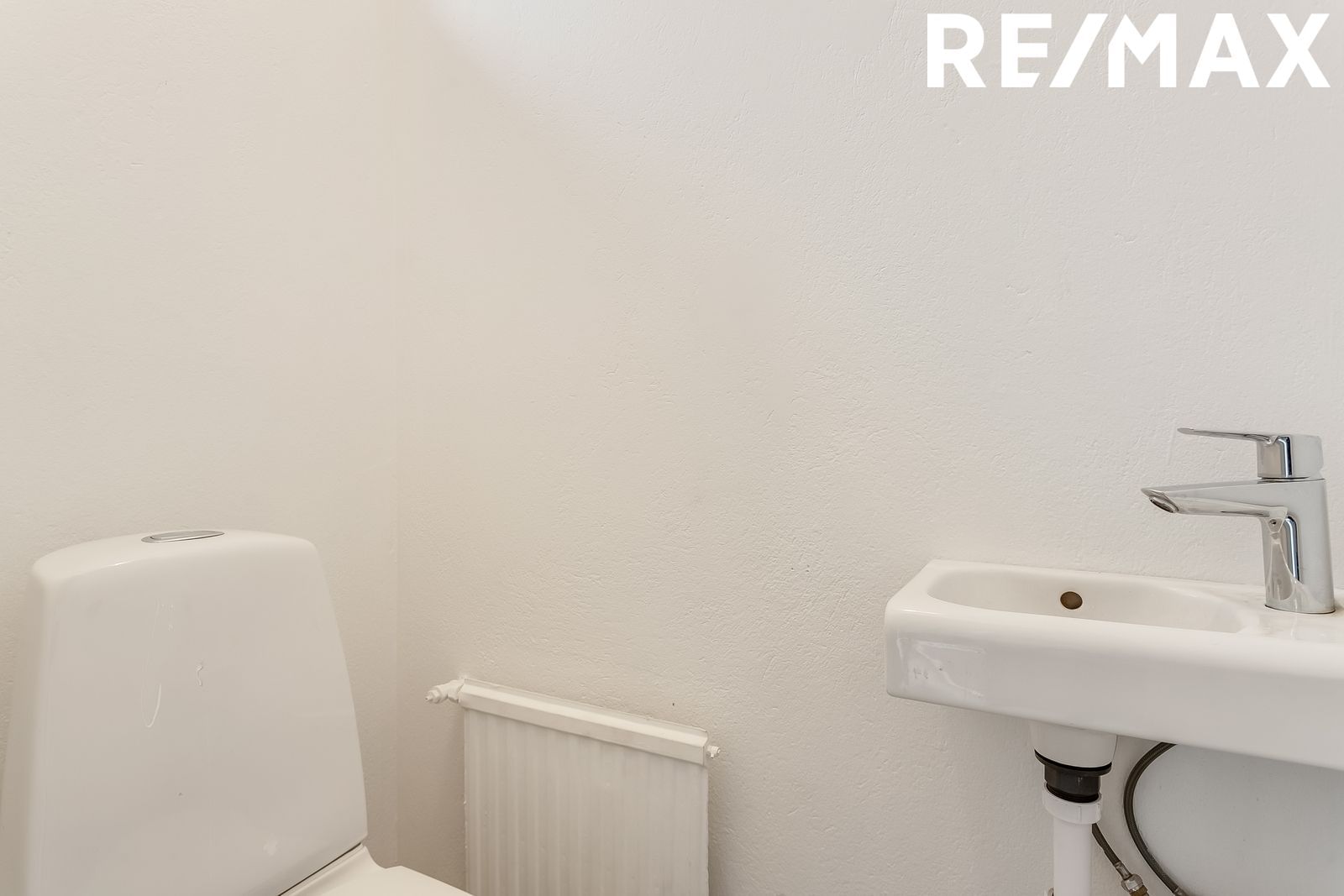 Gestasnyrting: á vinstri hönd úr forstofu með flísum á gólfi og glugga.