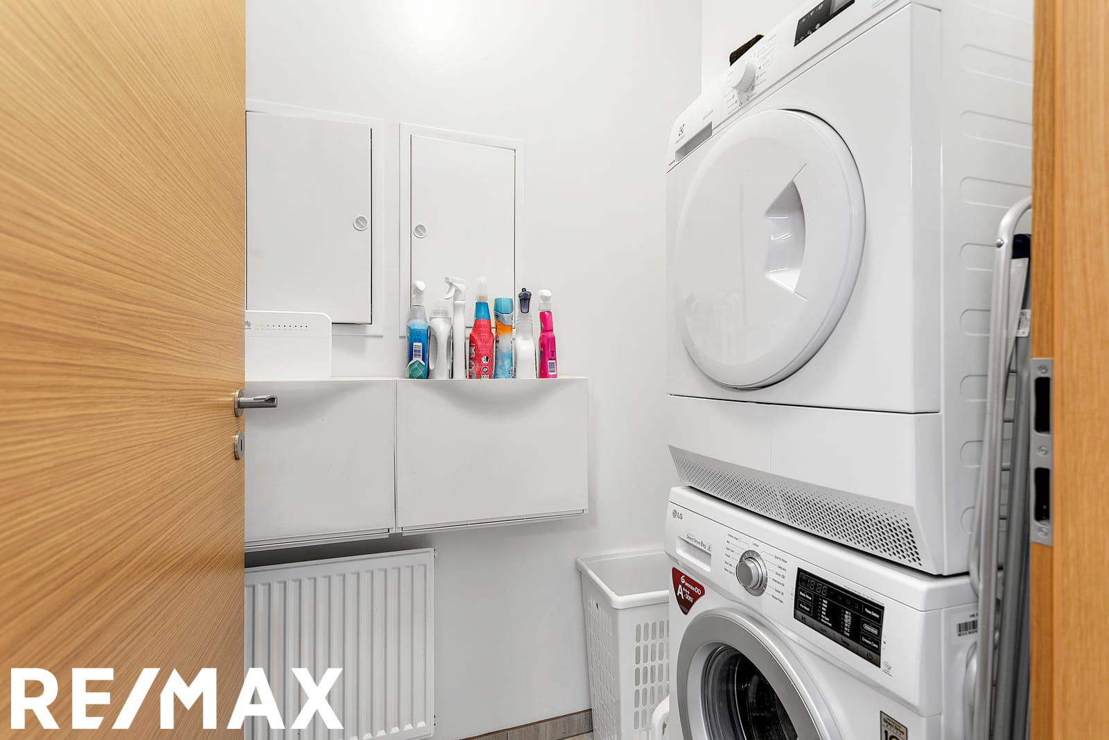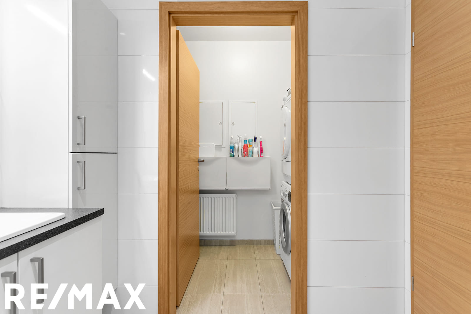 Þvottahús er inn af baðherbergi. Aðstaða og tengi fyrir þvottavél og þurrkara. Stálvaskur. Ljósar flísar á gólfi.