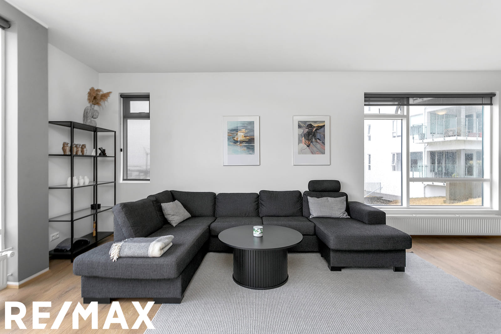 Stofa er rúmgóð og björt með fallegu útsýni yfir vatnið og til sjávar til vesturs. Parket á gólfi.