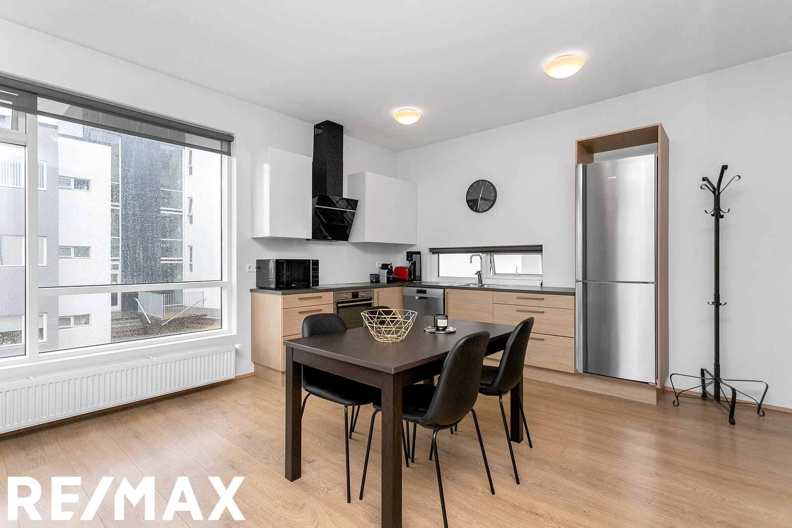 Eldhús er með eikar- og hvítri háglans innréttingu með ljúflokunum. Innrétting frá HTH og eldhústæki frá AEG. Parket á gólfi. Útgengi út á suðvestursvalir.