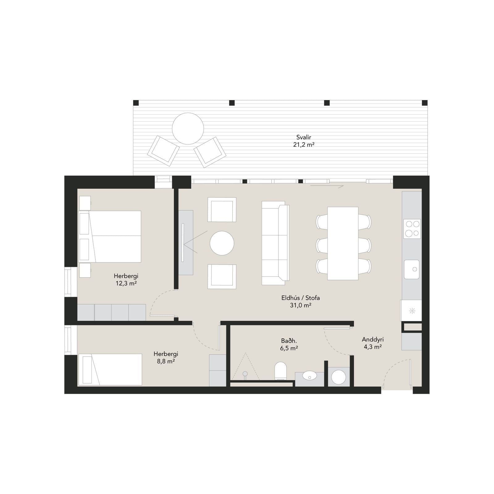 Íbúð 203 er glæsileg þriggja herbergja íbúð á 2. hæð með sérmerktu stæði á lóð. Samkvæmt Þjóðskrá Íslands er eignin 82,8 fm, þar af er geymsla í kjallara 8,9 fm. Útgengt á 21,2 fm yfirbyggðar svalir.