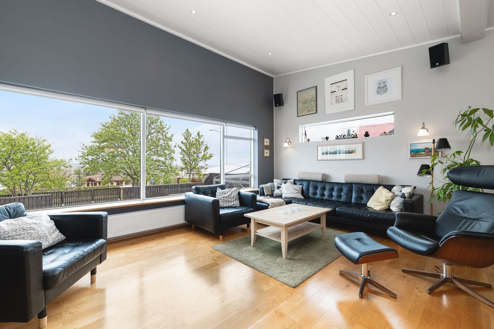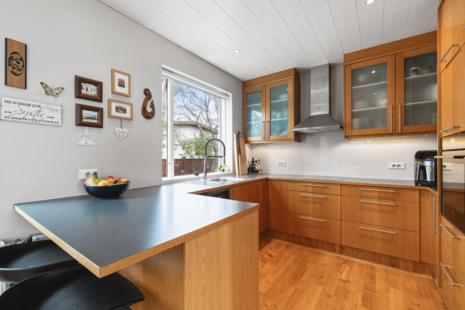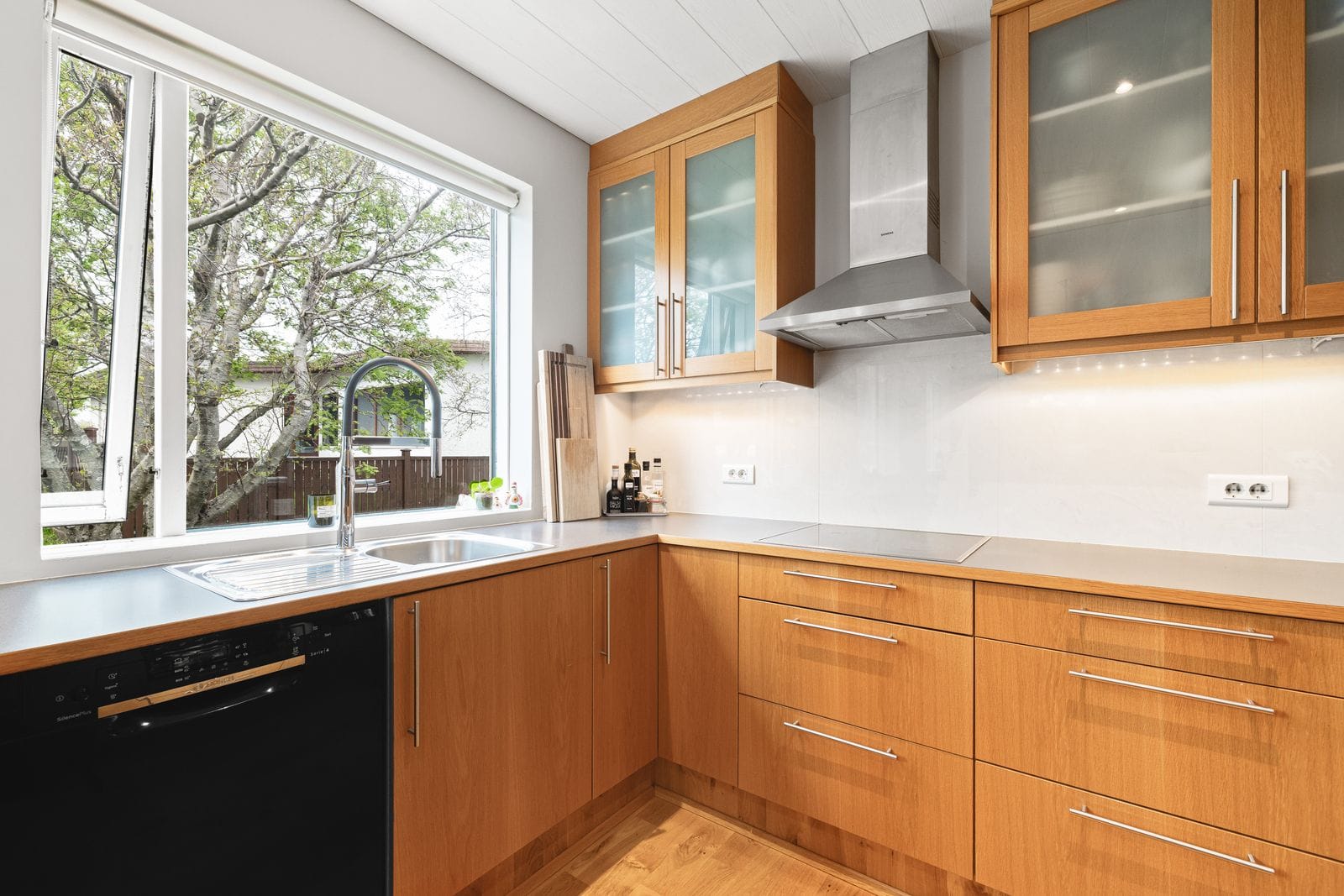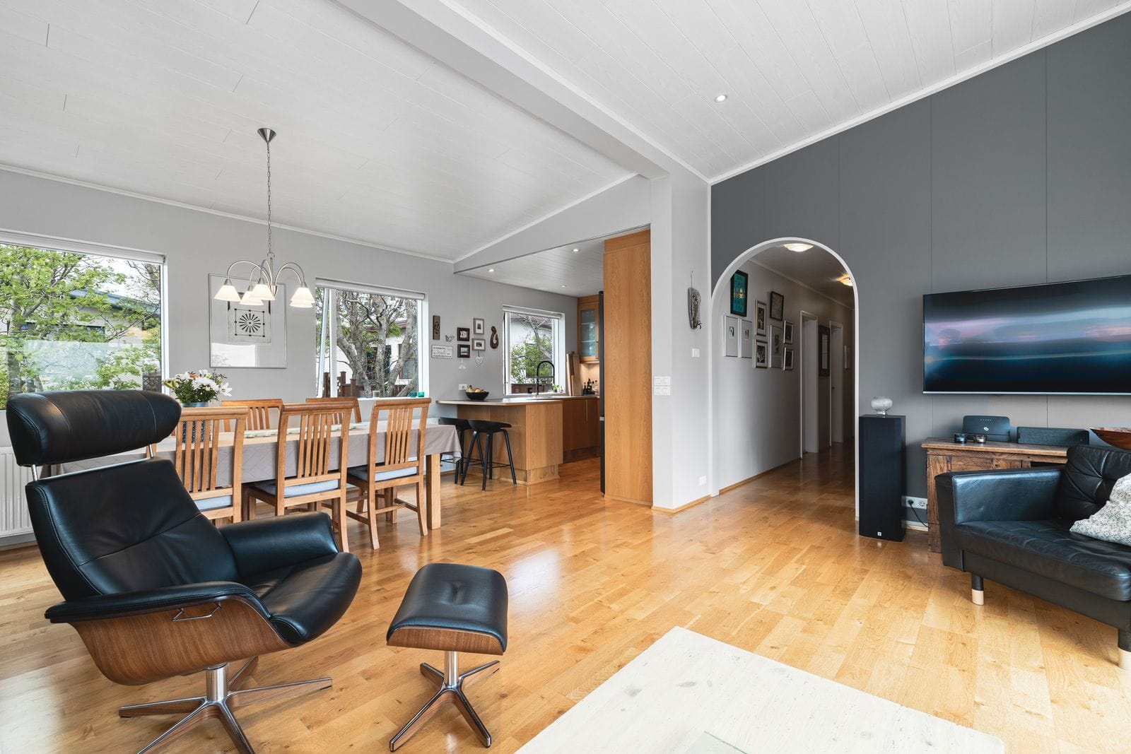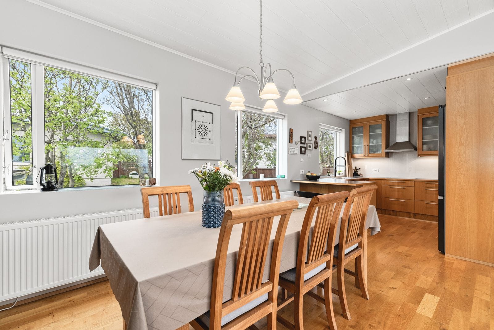 Bílskúr: Flísalagður með nýlegri eldhúsinnréttingu, baðherbergi með sturtu og stæði fyrir þvottavél og þurrkara. Hentar vel sem stúdíóíbúð.