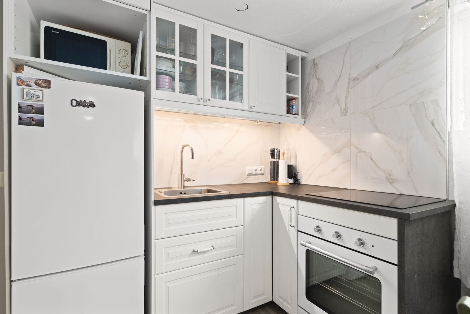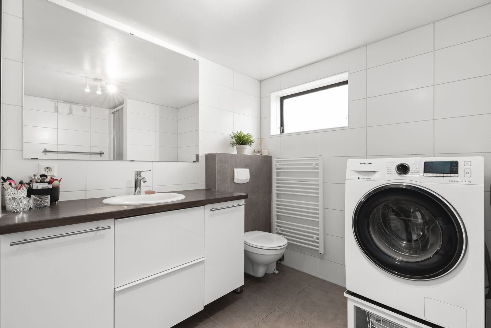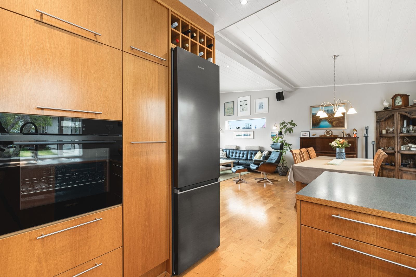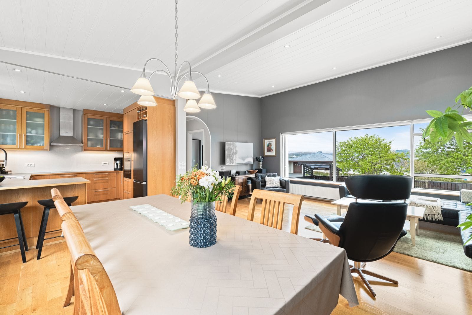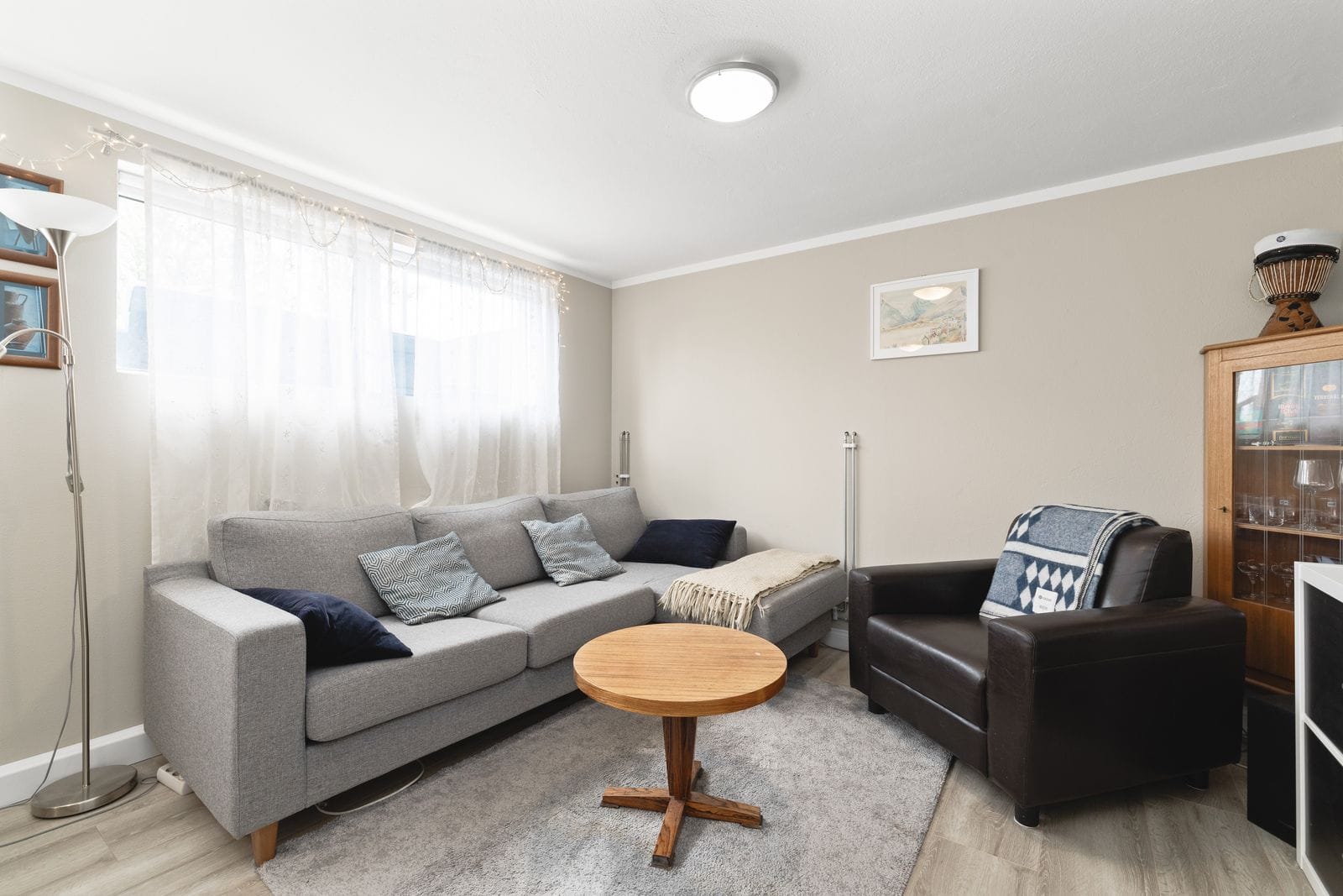 Bílskúr: Flísalagður með nýlegri eldhúsinnréttingu, baðherbergi með sturtu og stæði fyrir þvottavél og þurrkara. Hentar vel sem stúdíóíbúð.