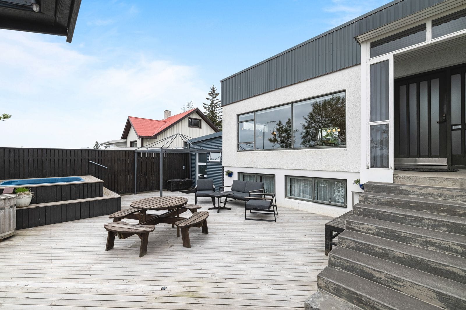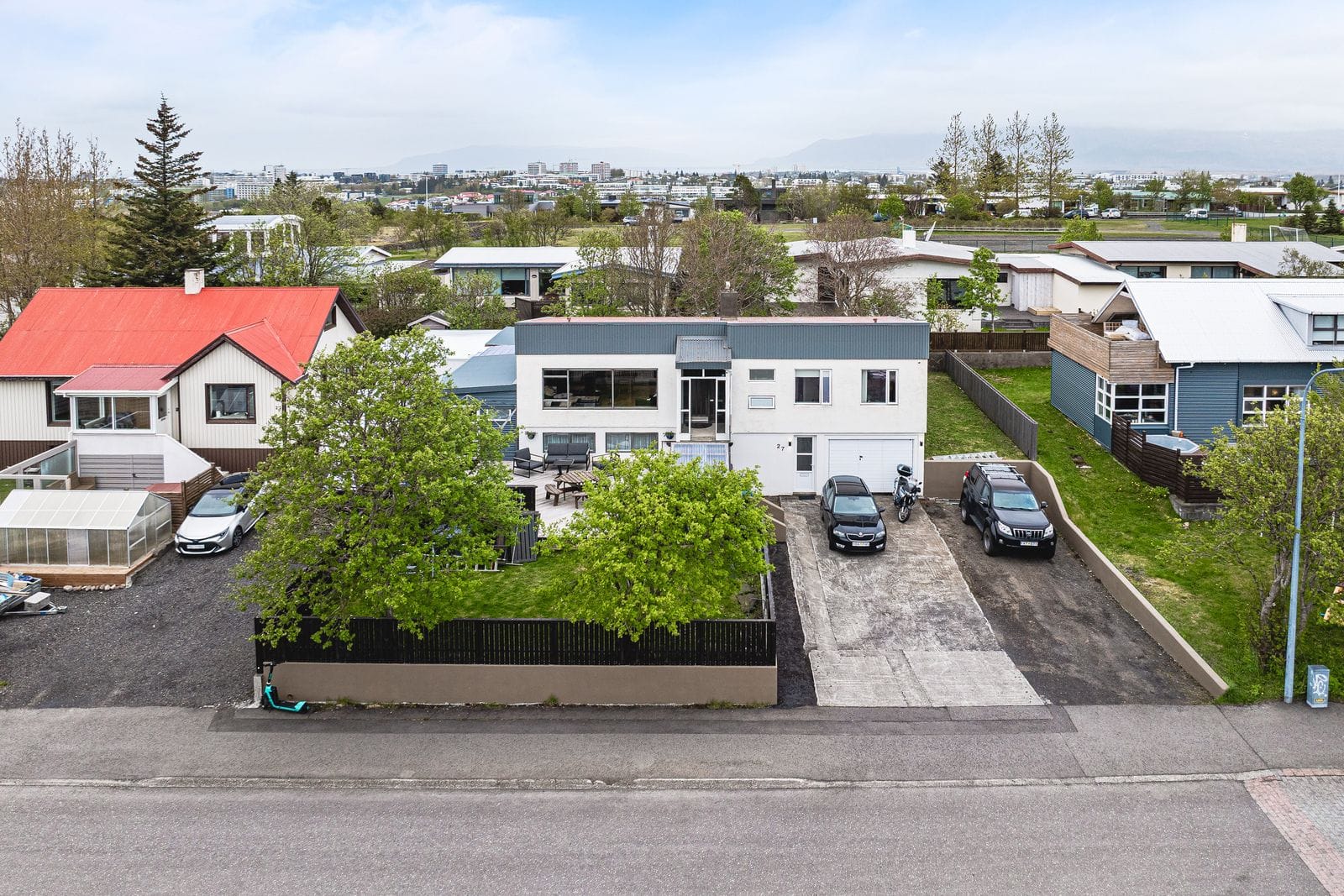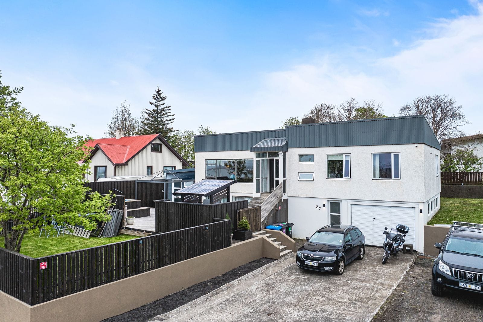 Lóð og aðkoma: Eigninni fylgir stór lóð með steyptum vegg meðfram lóðarmörkum. Framgarður með stórum palli með heitum potti ásamt stórum grasbletti og grillstæði. Einstaklega stórt bílaplan sem rúmar auðveldlega allt að 9 bifreiðar . Tröppur upp að anddyri með snjóbræðslu að hluta.