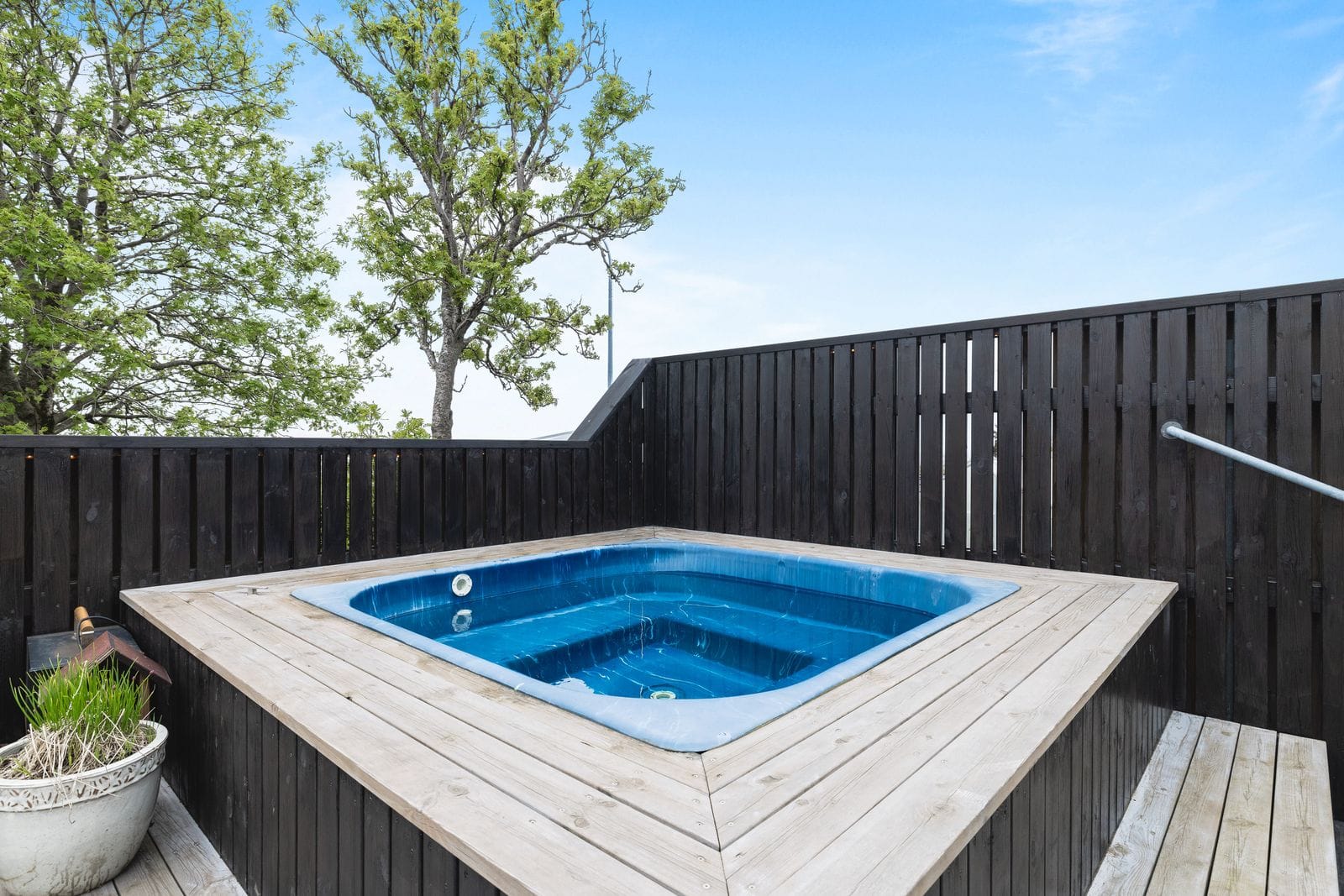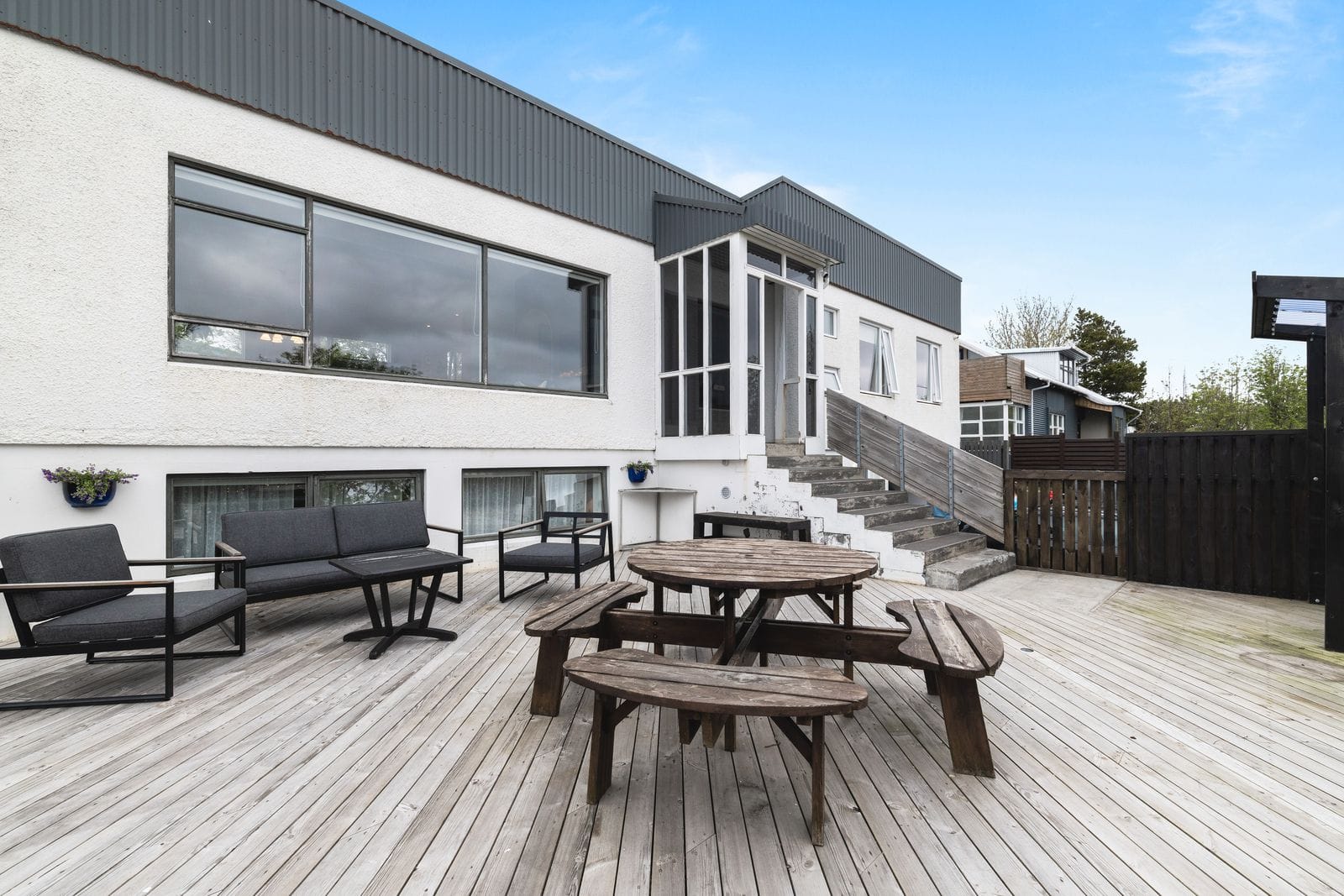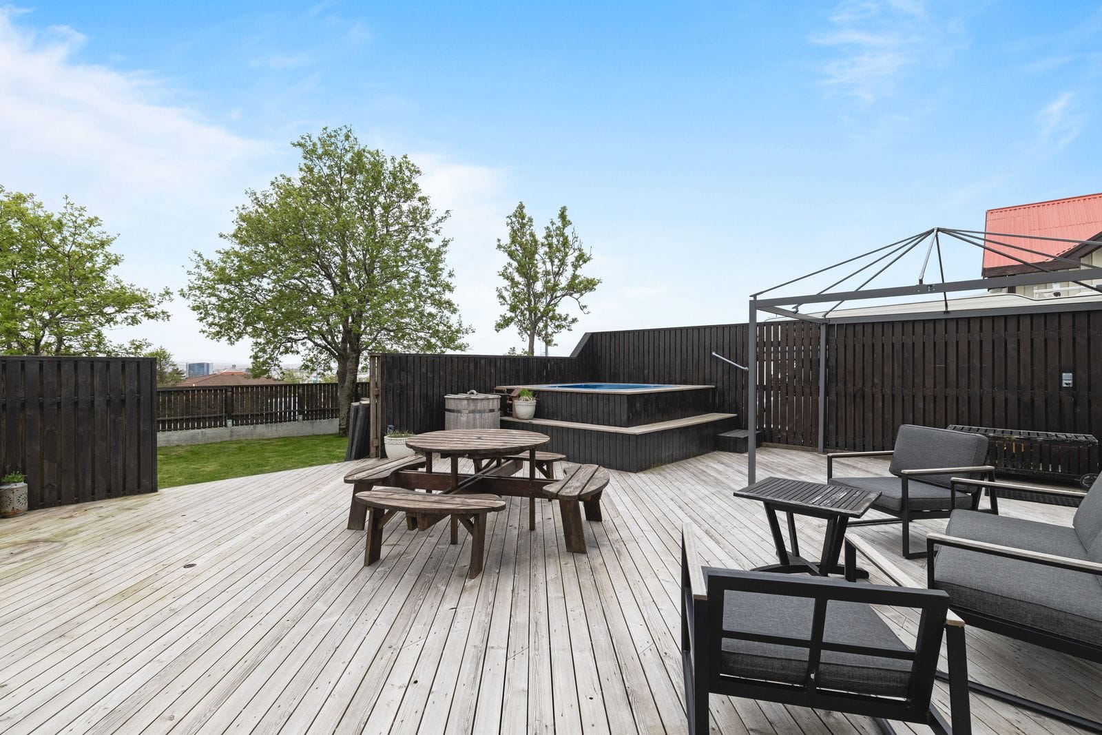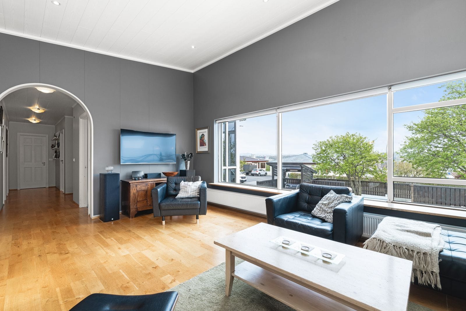 Lóð og aðkoma: Eigninni fylgir stór lóð með steyptum vegg meðfram lóðarmörkum. Framgarður með stórum palli með heitum potti ásamt stórum grasbletti og grillstæði. Einstaklega stórt bílaplan sem rúmar auðveldlega allt að 9 bifreiðar . Tröppur upp að anddyri með snjóbræðslu að hluta.
