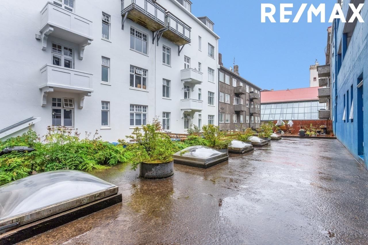 Skjólgóður inngarður bakatil sem er i óskiptri sameign eigenda hússins.