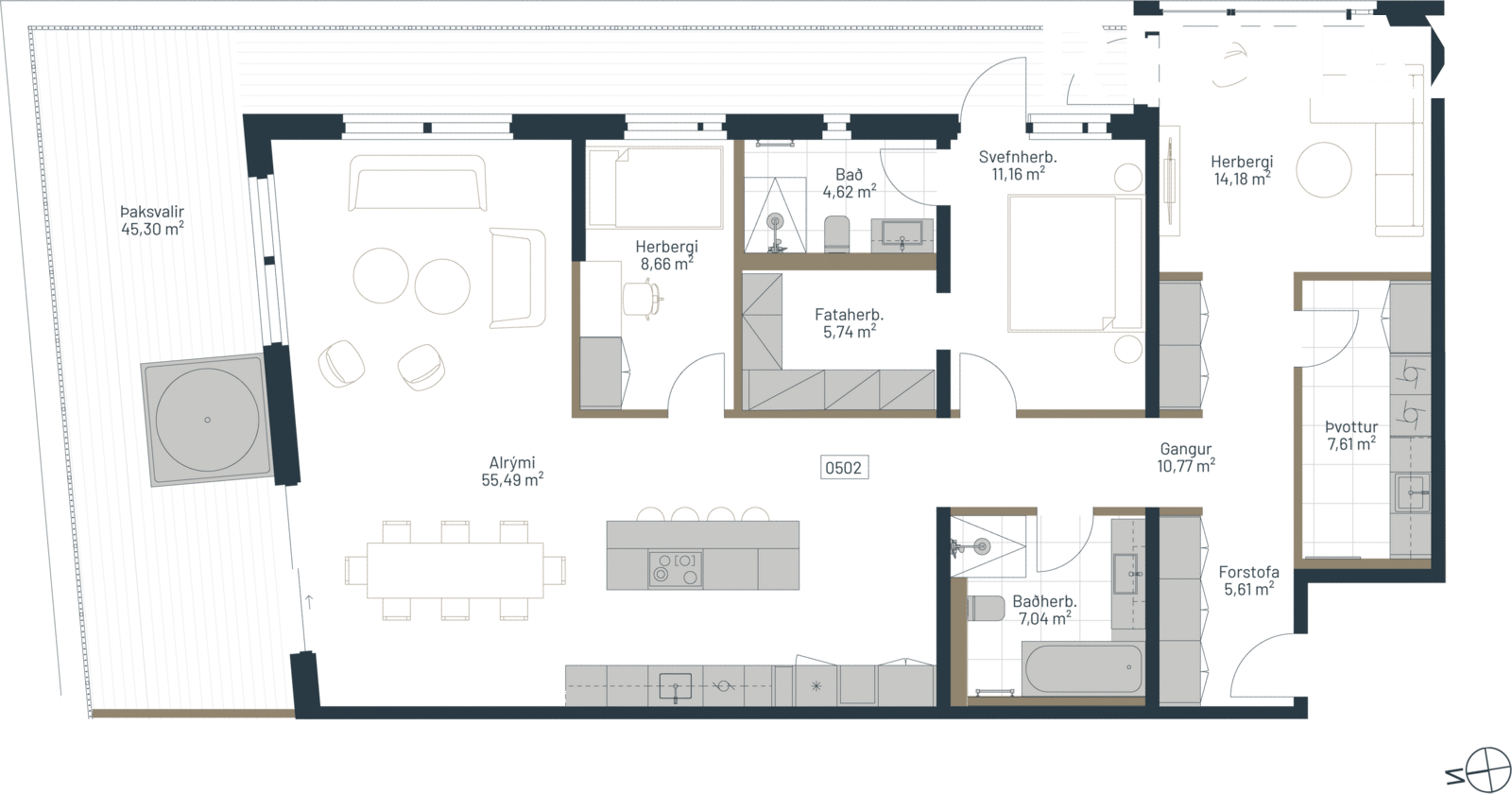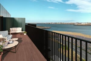 Íbúð 502: Stórglæsileg fjögurra herbergja, 166,8 m2 útsýnisíbúð á efstu hæð með 45,3 m2 þaksvölum með vandaðri Bambus klæðningu á svalagólfi og gert ráð fyrir heitum potti á svölum. Hjónasvíta með fataherbergi og sér baðherbergi, 290 cm lofthæð, gólfhiti og stórir gólfsíðir gluggar.