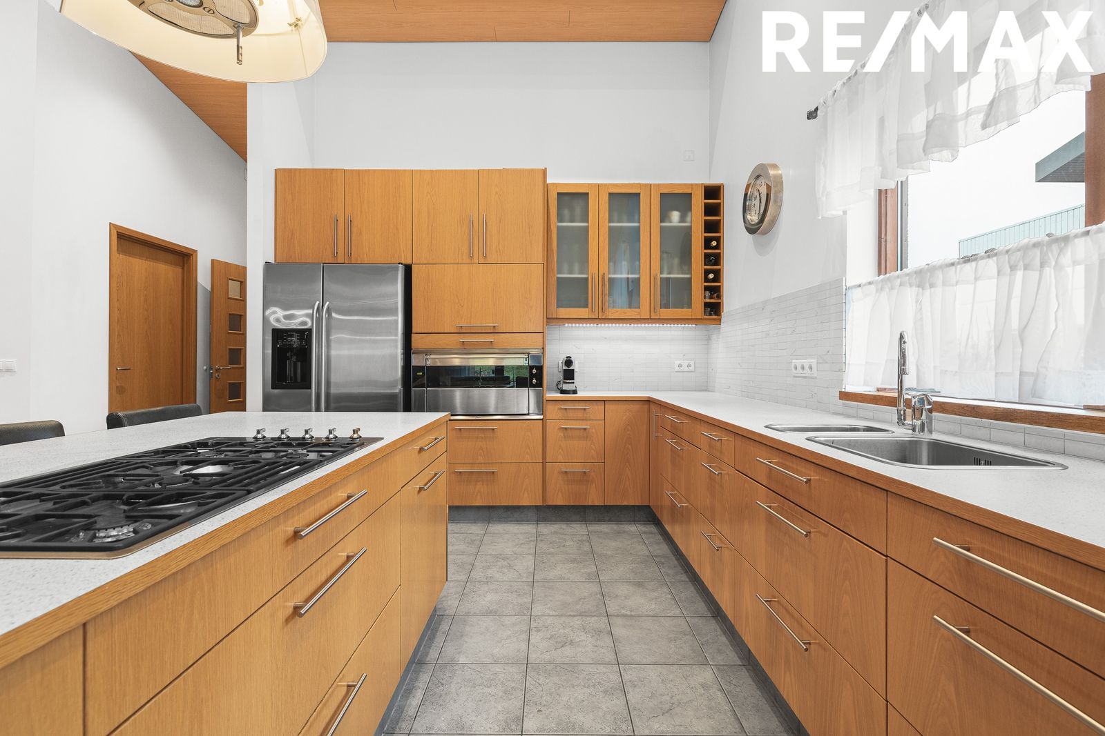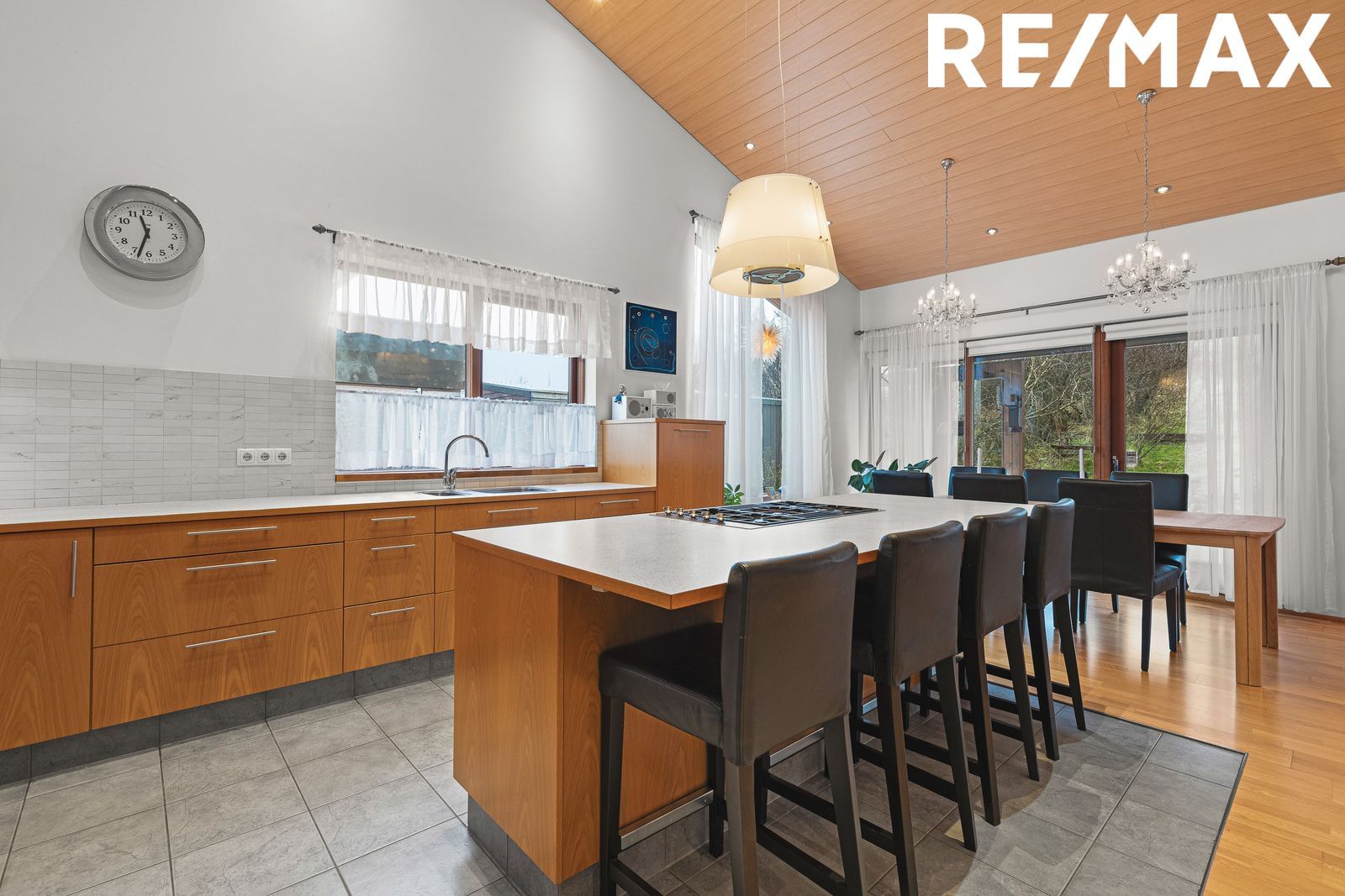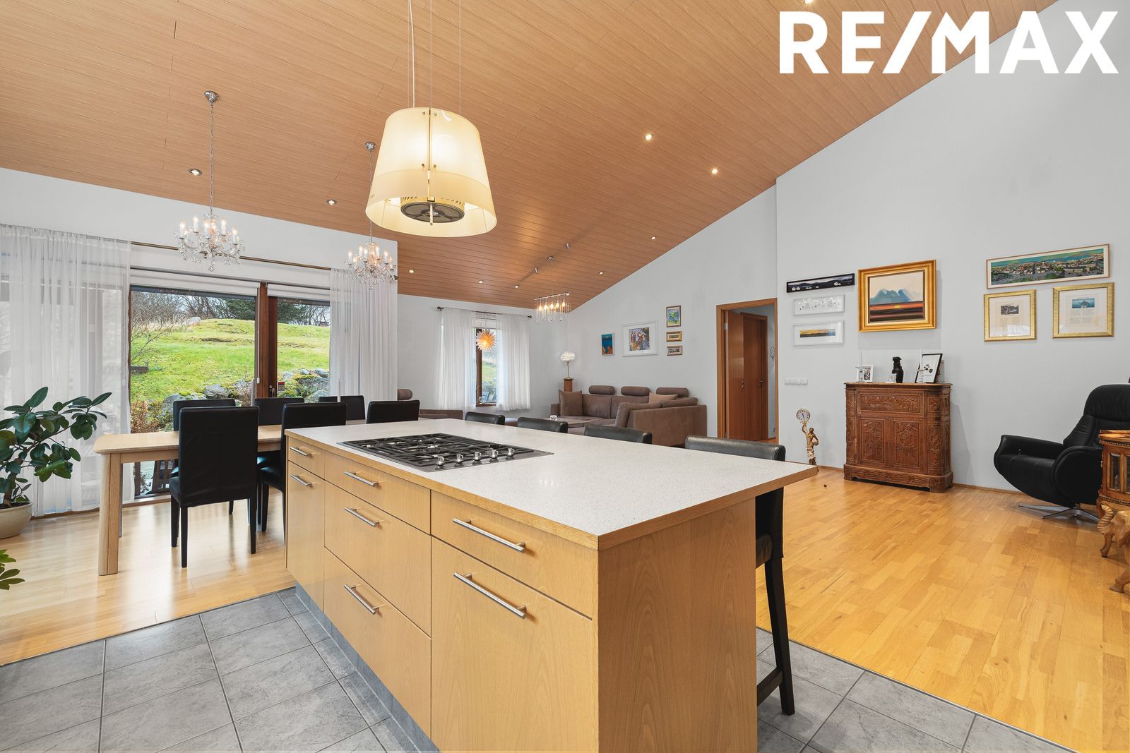 Eldhús / borðstofa / stofa:  Bjart og rúmgott alrými, mjög hátt til lofts, sérsmíðuð eldhúsinnrétting, mjög gott vinnu og skápapláss, innbyggð uppþvottavél, eldhúseyja með gashelluborði, háfur yfir eyju, á gólfi eldhúshluta alrýmis eru flísar.  Borðstofa / eldhús viðparket á gólfi,  gengið út á timburverönd og garð.