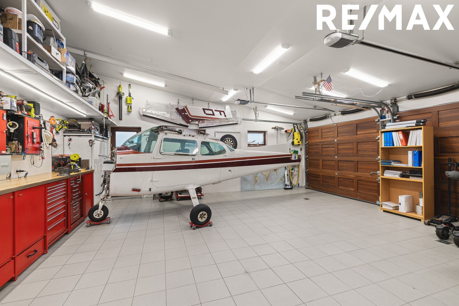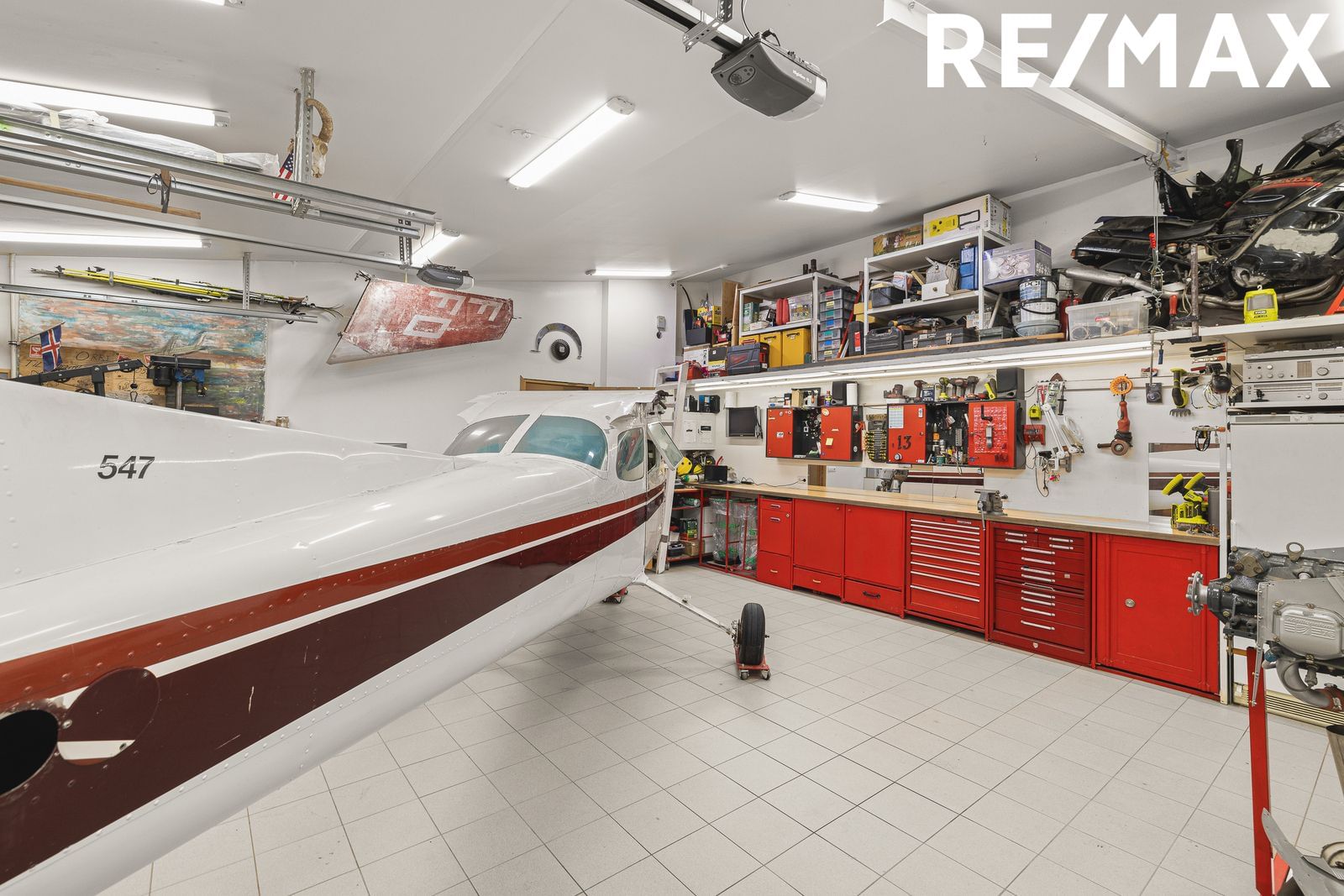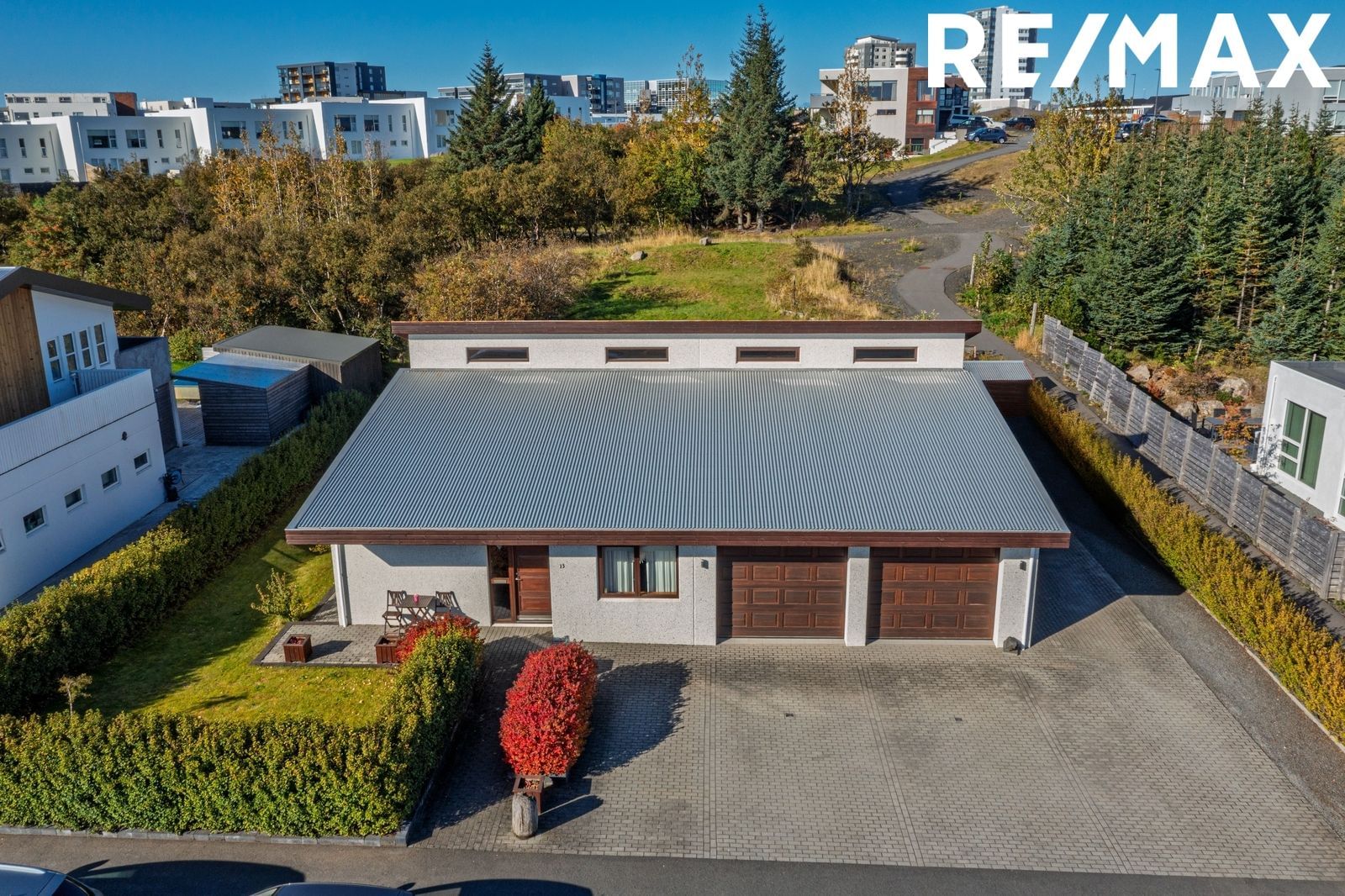 Bílskúr:  Rúmgóður bílskúr 56m2,  sérsmíðuð innrétting - skápar, tvær bílskúrshurðir, hleðslustöð fyrir rafmagnsbíl, flísar á gólfi, gengið út á lóð úr bílskúr.