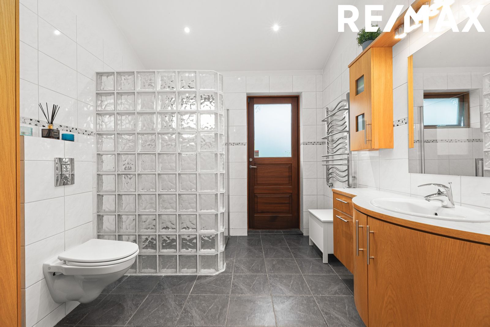 Baðherbergi: Sérsmíðuð innrétting, walk in sturta, vegghengt salerni,  flísar á gólfi, útgengt út á timburverönd og í heitan pott.