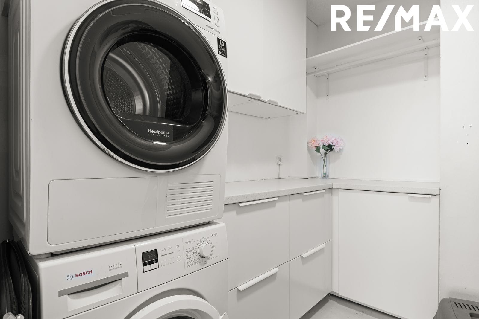 Þvottahús og geymsla er inn af eldhúsi. Hvít innrétting með stæði og tengi fyrir þvottavél og þurrkara. Gott borðpláss og nægt hillupláss. Niðurfall í gólfi og málað gólf.