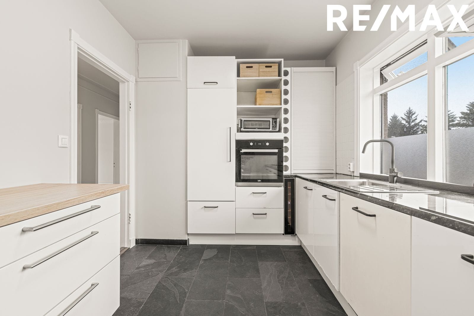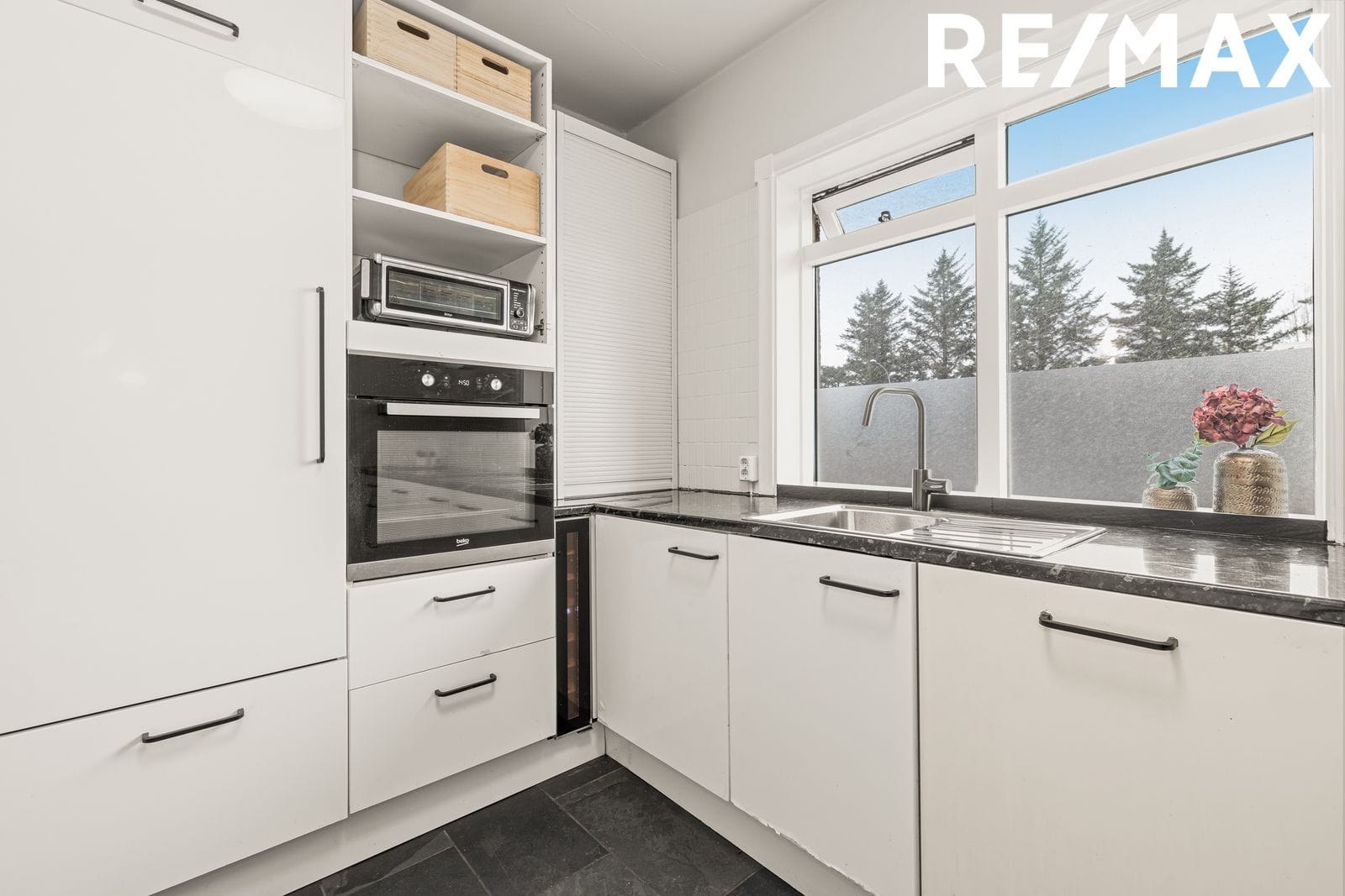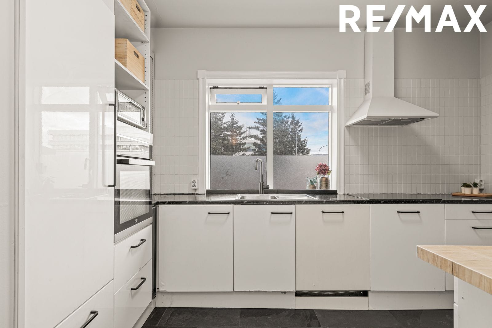 eldhúsi er hvít innrétting með ágætis skápaplássi, dökk borðplata undir glugganum en filmuð borðplata gengt glugganum, tengi fyrir uppþvottavél og flísar á gólfi. Vaskur, blöndunartæki og helluborð endurnýjuð 2026.