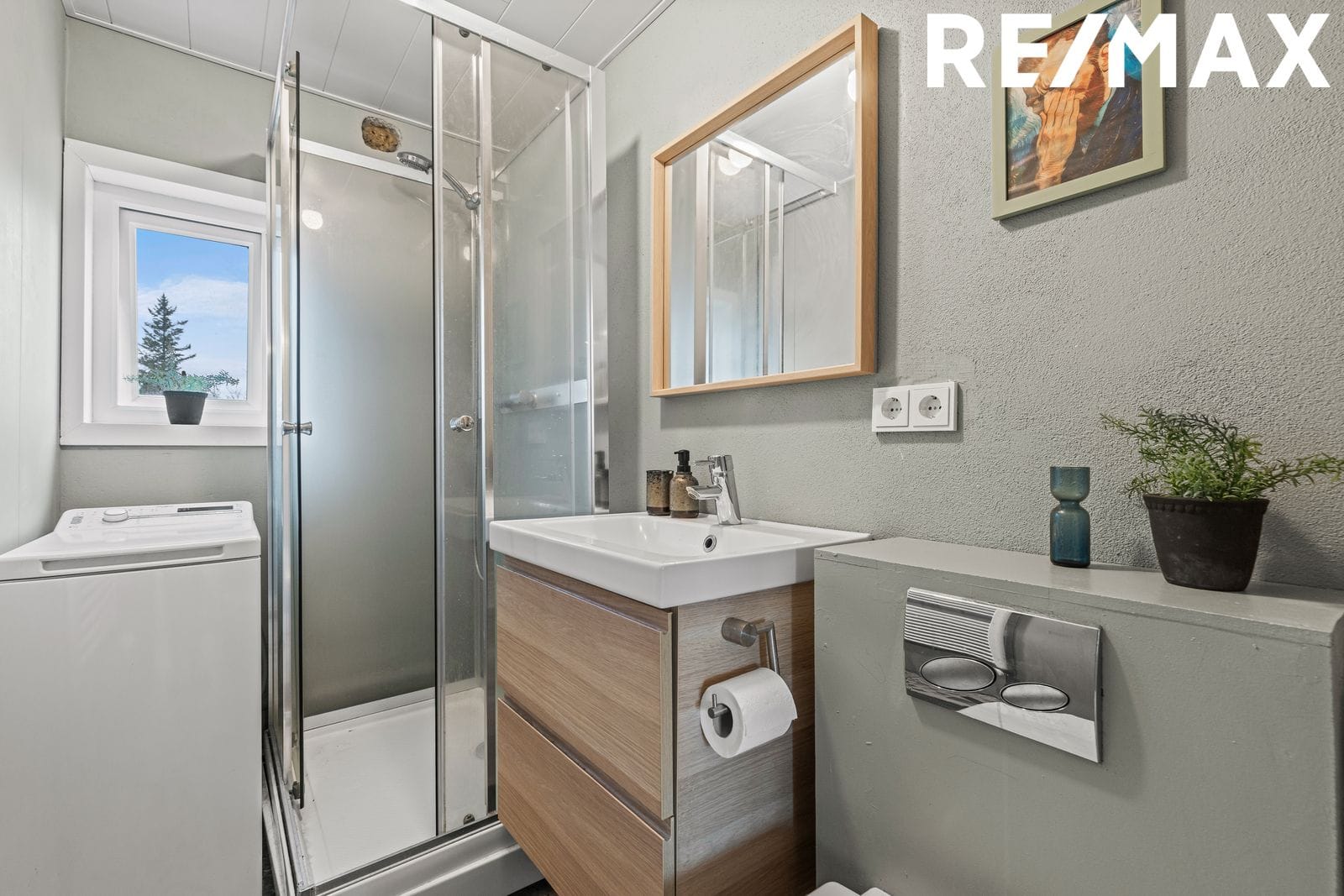 Svefnherbergið er aðskilið frá stofu með góðum fataskáp. Við hlið herbergis er baðherbergið með upphengdu salerni, sturtuklefa, innréttingu undir handlau, handklæðaofni, tengi fyrir litla þvottavél og flísum á gólfi.