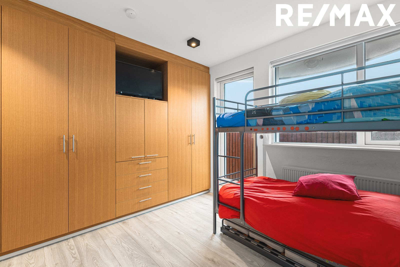 Svefnherbergi III: Er rúmgott með tvöföldum fataskápum sem ná upp í loft.
