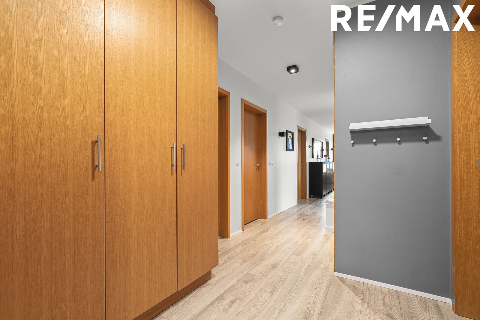 Komið er inn í forstofu með fataskápum.