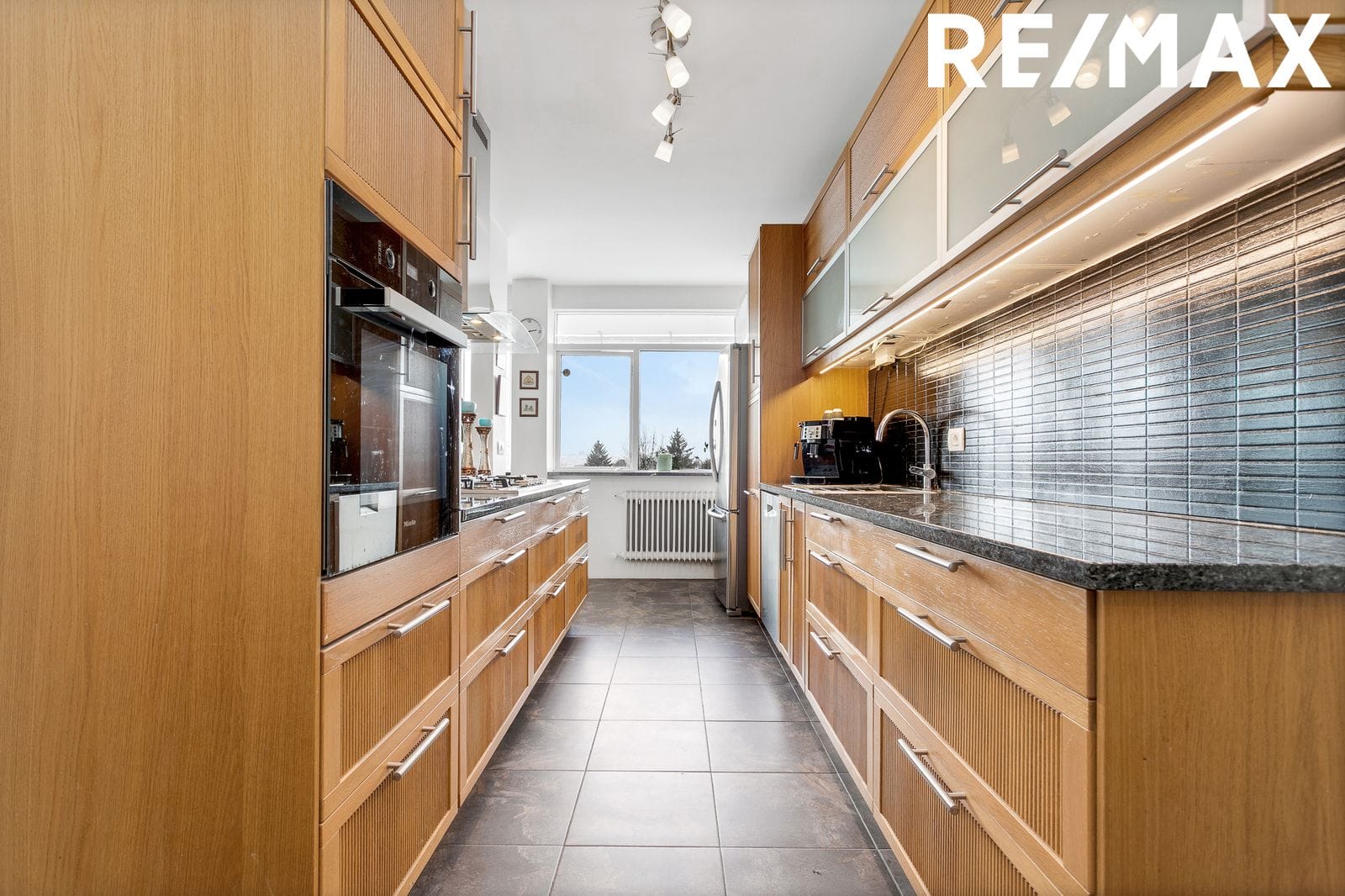 Eldhús Rúmgott eldhús með fallegri innréttingu, ofni og gaseldavél. Flísar á gólfi, gott skápapláss og vinnurými.