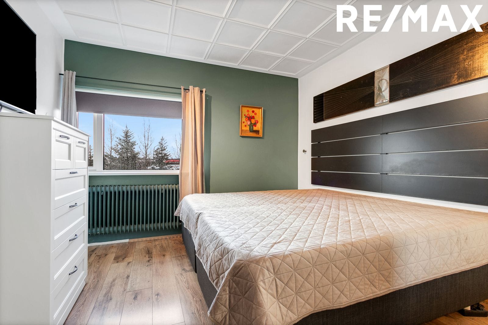 Hjónaherbergi Rúmgott með parketi á gólfi.