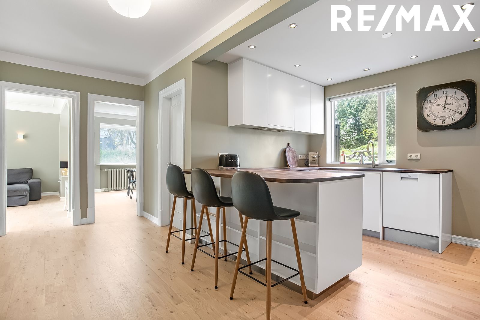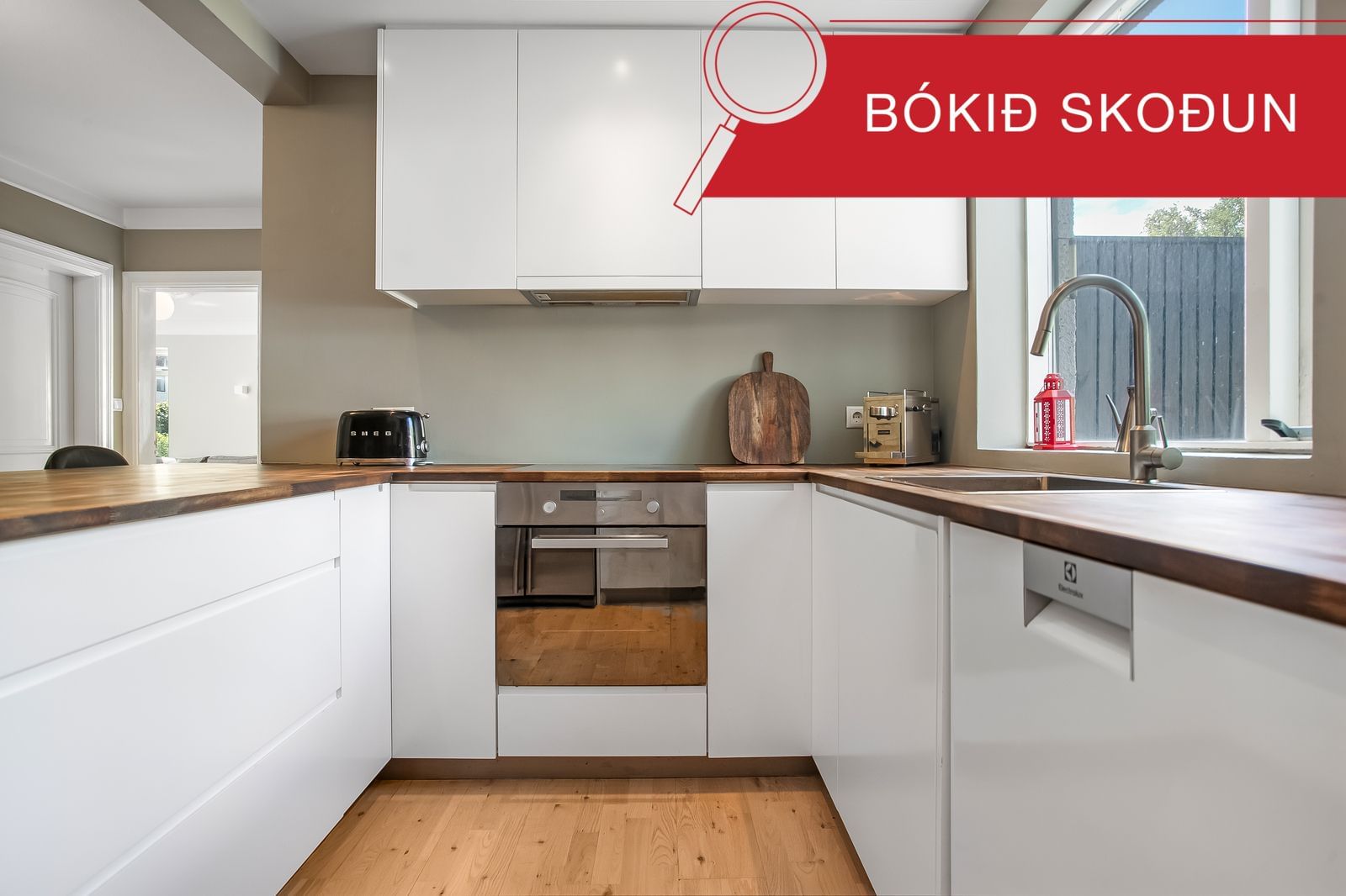 Eldhús hefur verið endurnýjað á afar smekklegan máta með hvítri eldhúsinnréttingu með viðar borðplötu. Tengi fyrir uppþvottavél og tvöfaldan ísskáp. Gott skápa- og vinnupláss. Góður gluggi er í eldhúsi sem gerir það einstaklega bjart og fallegt. Parket á gólfi. Innangent í þvottahús er úr eldhúsi.