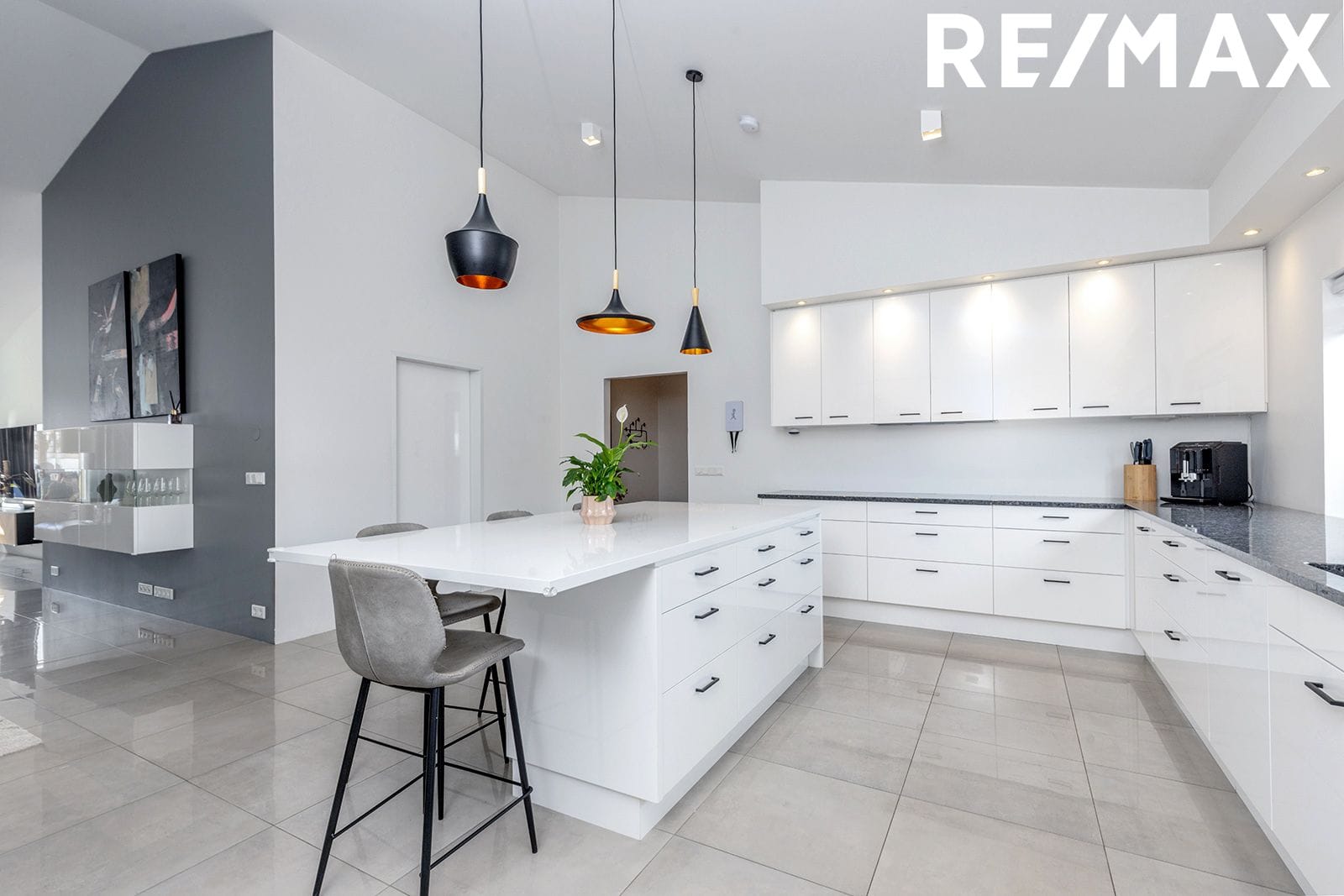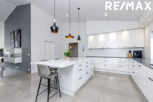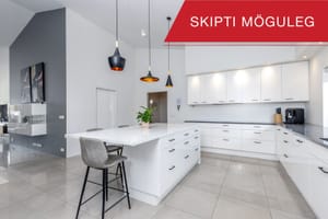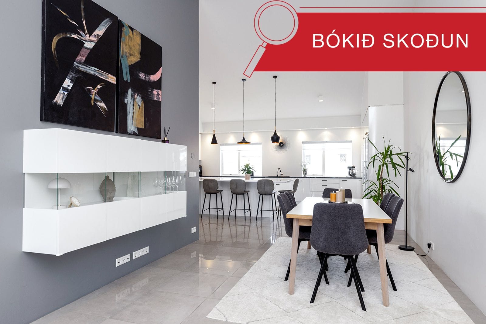 Eldhús er stórt með sérmíðaðri hvítri, háglans innréttingu frá Beyki, gert er ráð fyrir tveimur uppþvottavélum og tvöföldum ísskáp/frystiskáp í innréttingu, borðplatan er úr fallegum dökkgráum granítstein, stór eyja með hvítri háglans borðplötu sem hægt er að sitja við, spanhelluborð, blástursofn í vinnuhæð og gufugleypir, góð innbyggð lýsing. Inn af eldhúsi er rými sem er nýtt sem fataskápur fyrir útiföt (hægt að nýta sem búr eða geymslu).