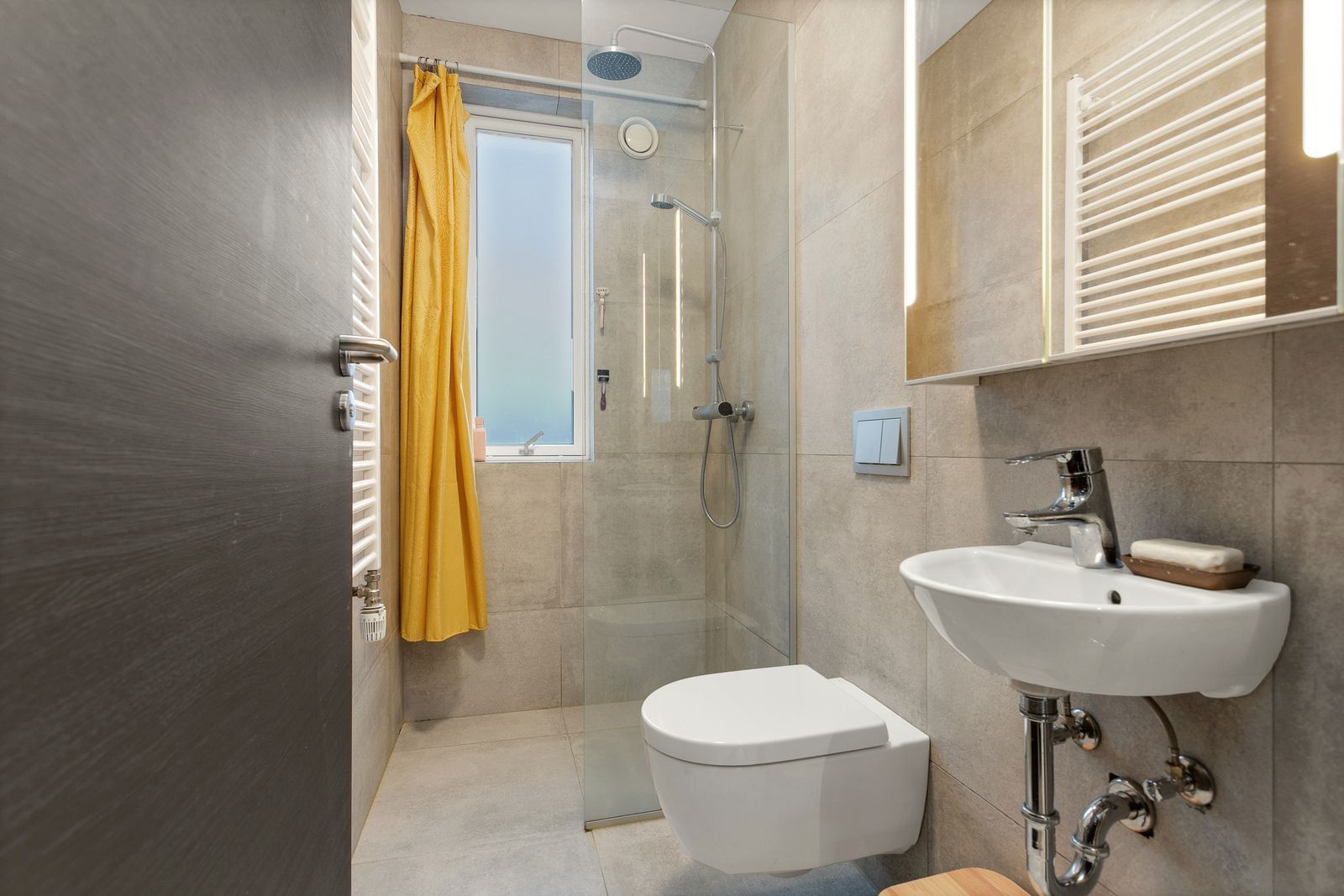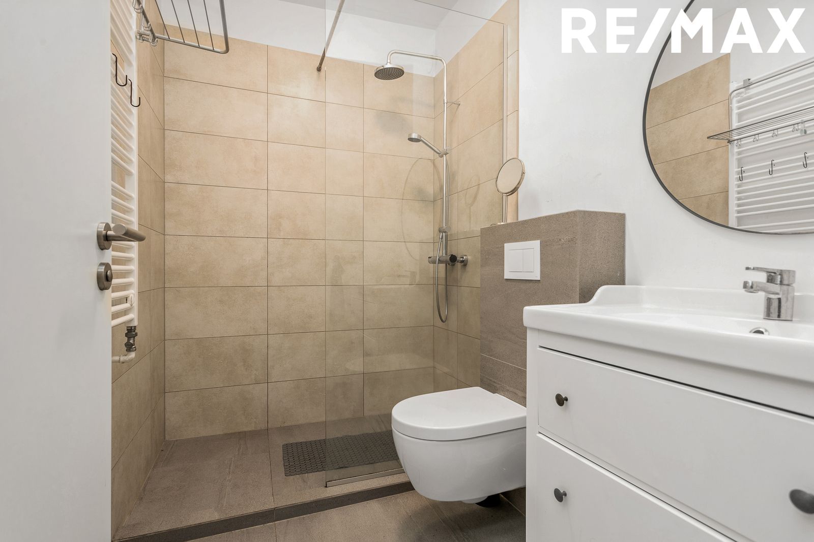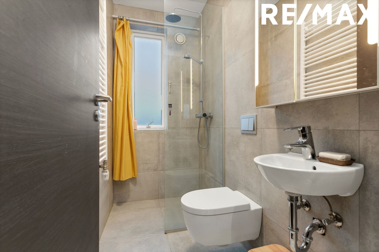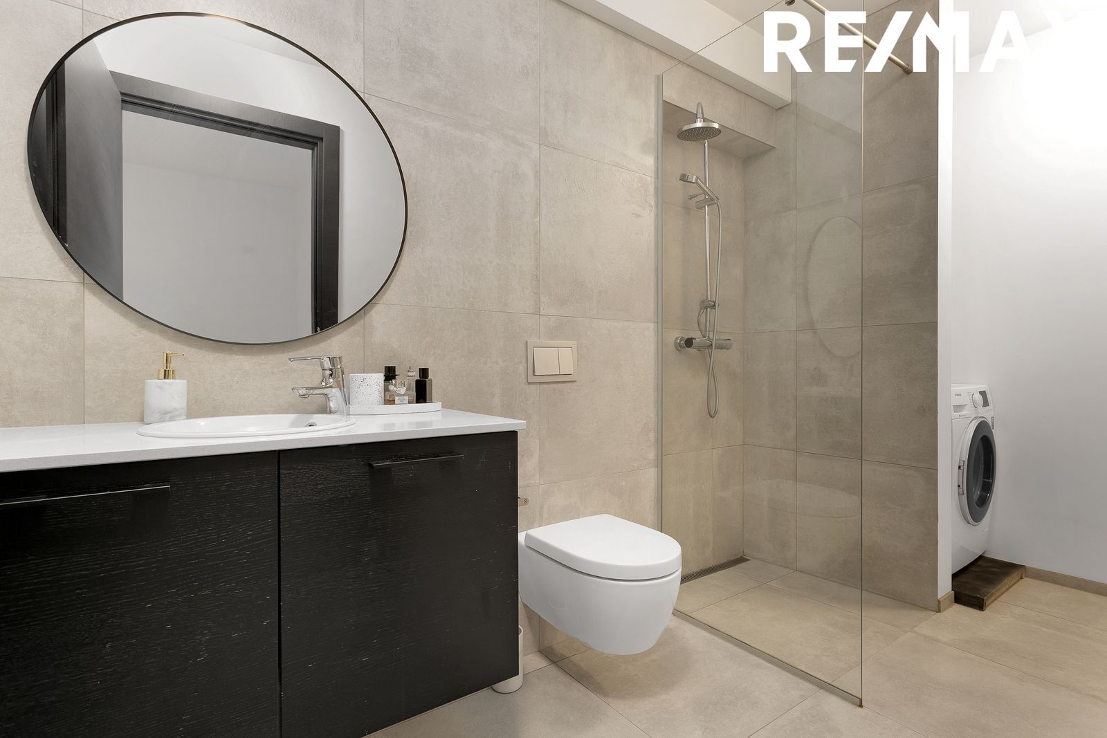 Baðherbergið er með flísum á hluta af veggjum og á gólfi. Góð sturta og upphengt salerni og handklæðaofn. Baðinnrétting er með handlaug og spegil þar fyrir ofan. Inn af sturtu er tengi og aðstaða fyrir þvottavél og þurrkara.
