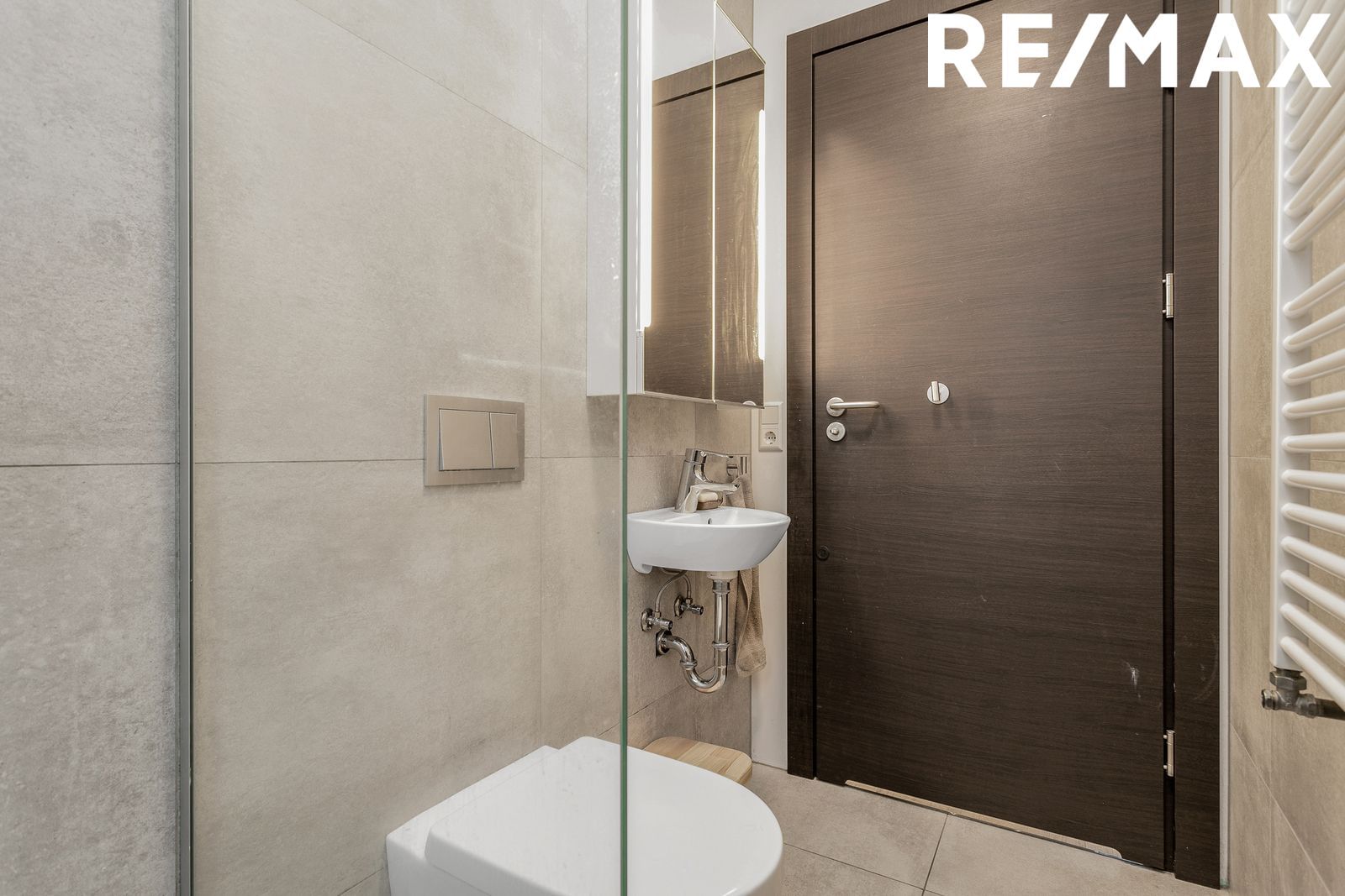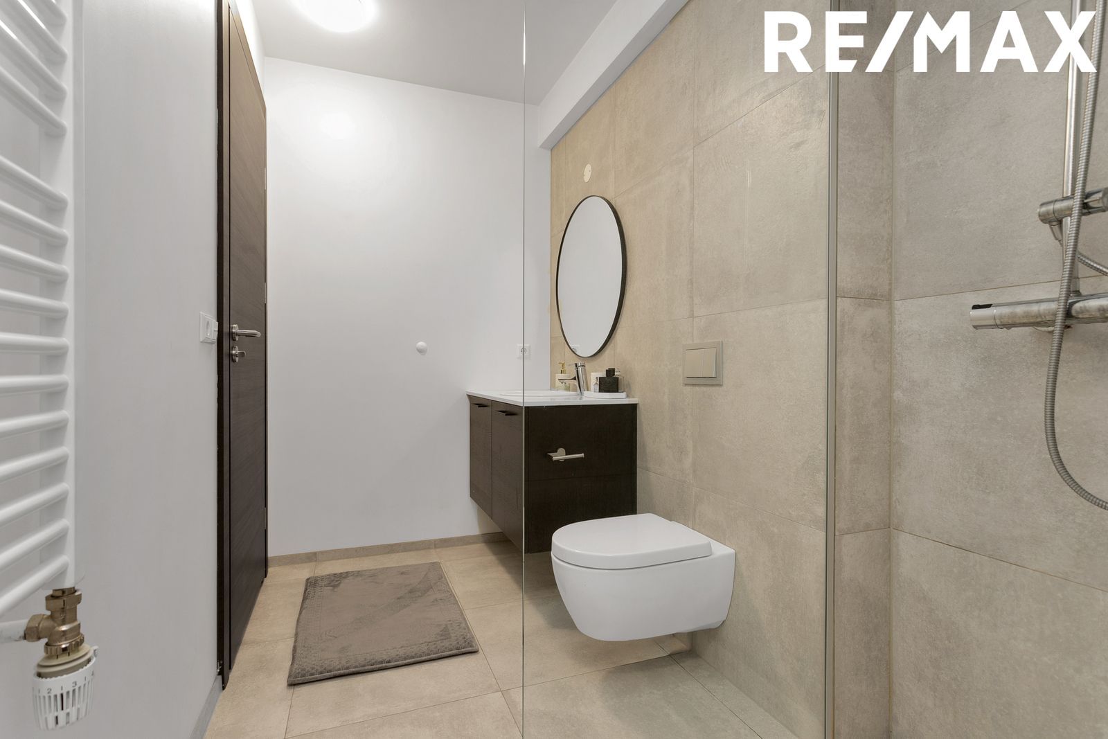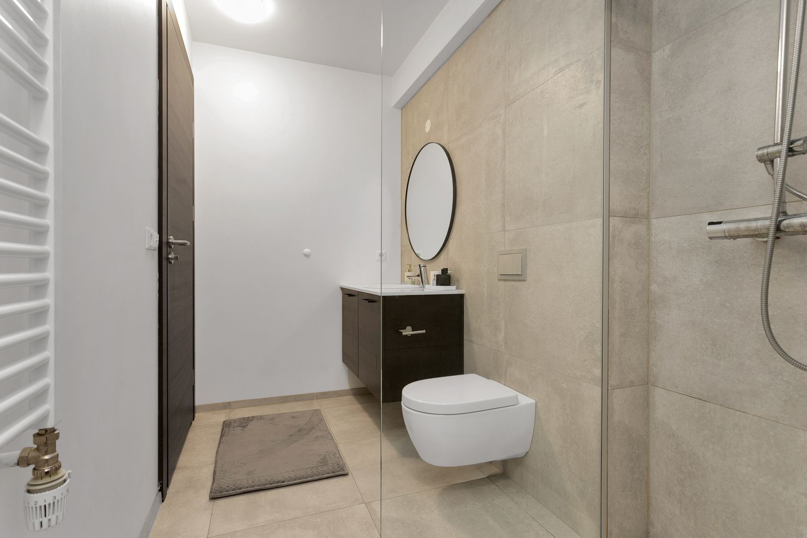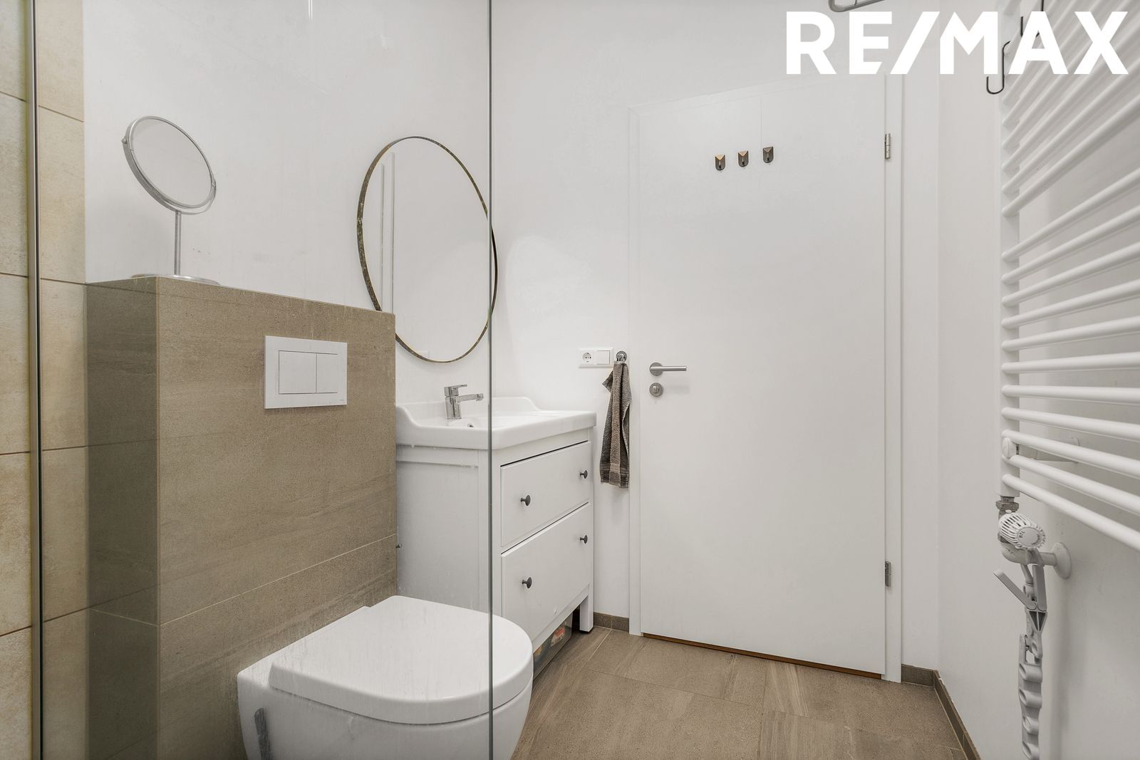 Baðherbergið er með flísum á hluta af veggjum og á gólfi. Góð sturta og upphengt salerni og handklæðaofn. Baðinnrétting er með handlaug og spegil þar fyrir ofan. Inn af sturtu er tengi og aðstaða fyrir þvottavél og þurrkara.