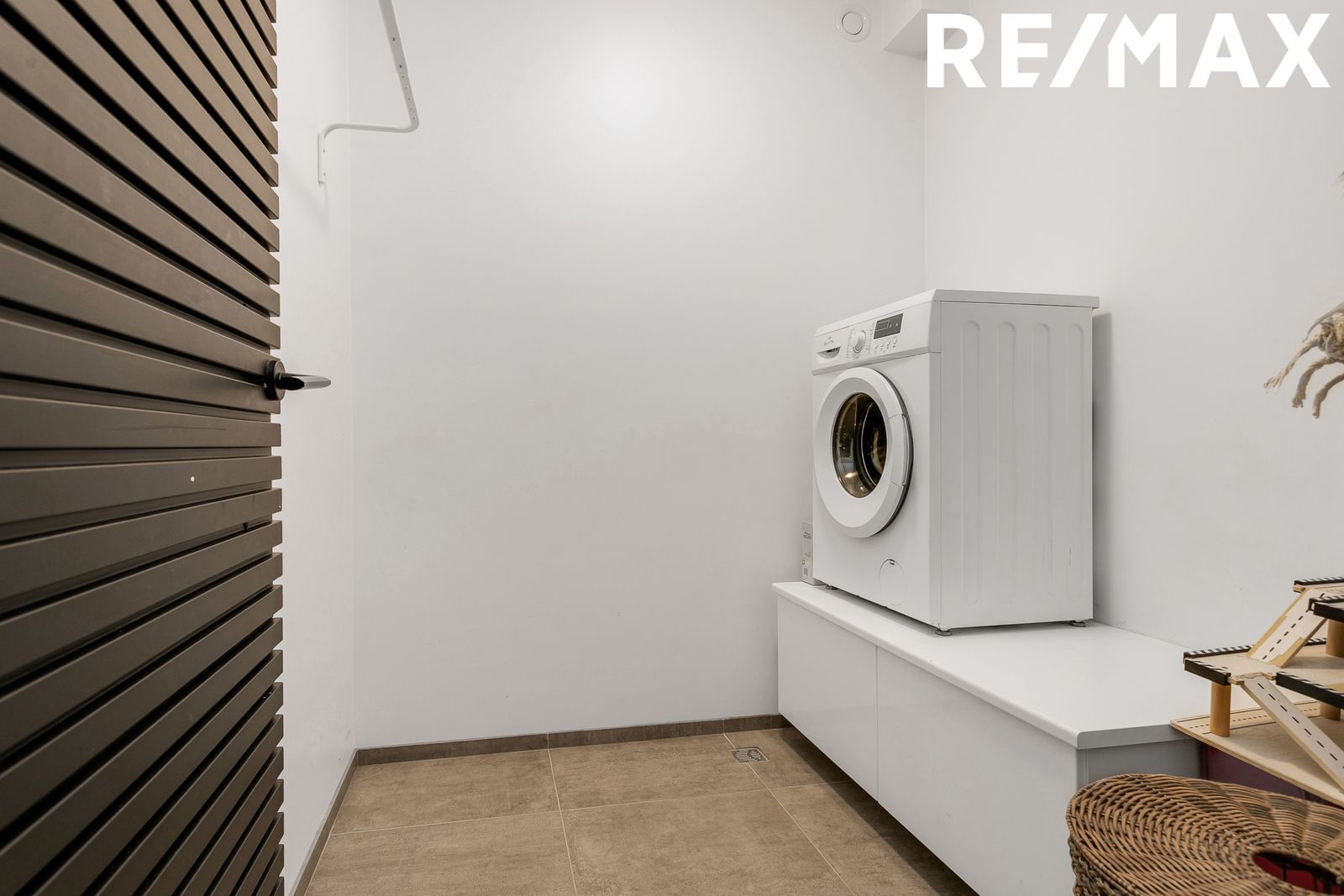 Geymsla/Þvottahús er með flísum á gólfi. Innrétting sem gerir ráð fyrir þvottavél og þurrkara í vinnuhæð.