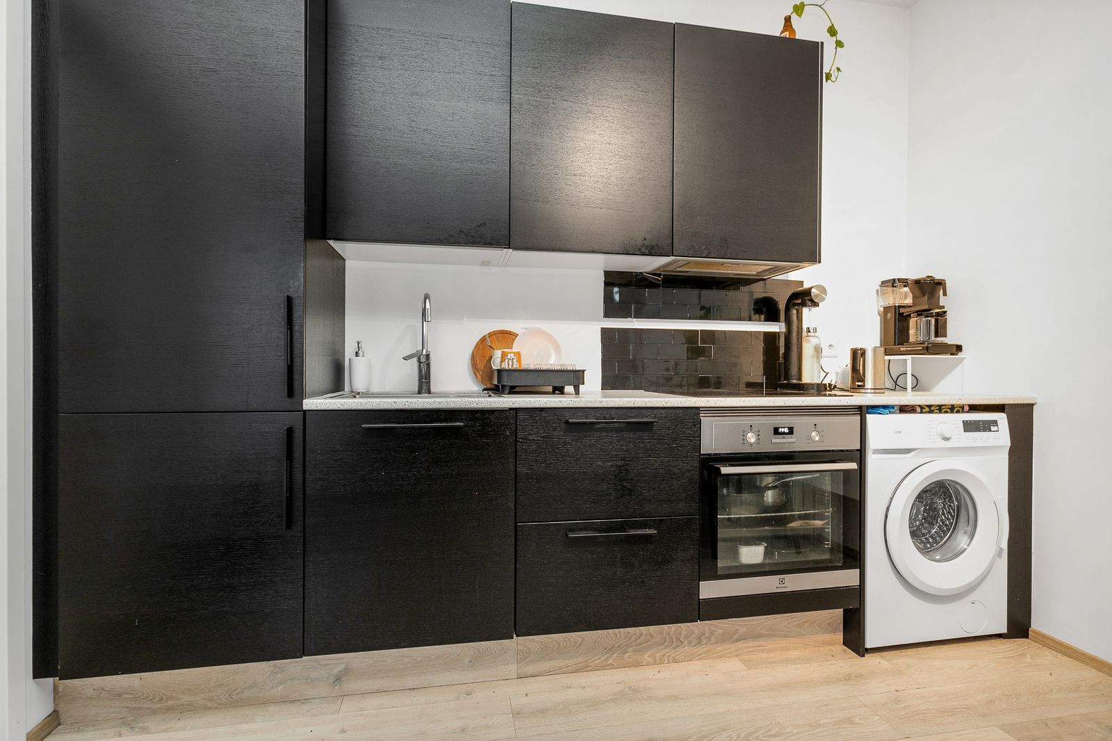 Eldhúsinnréttingin er með bæði efri og neðri skápa, innbyggðan ísskáp með frystir í og innbyggða uppþvottavél. Bökunarofn, helluborð með kolasíðu viftu þar fyrir ofan og vask þar við hlið.