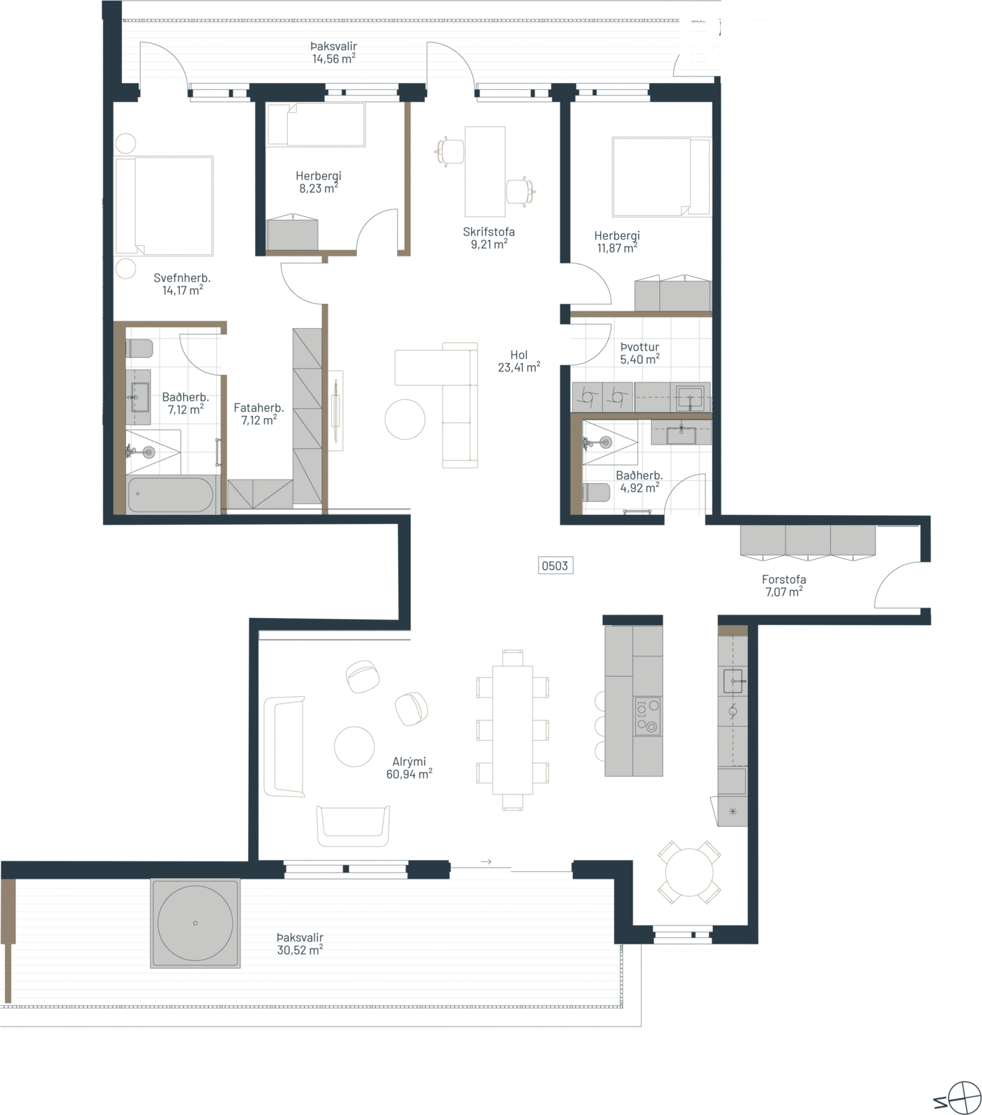 Íbúð 502: Stórglæsileg 5-6 herbergja, 193,7 m2 útsýnisíbúð á efstu hæð ásamt tveimur bílastæðum í bílageymslu. Tvennar þaksvalir 30,5m2/14,5m2 með vandaðri Bambus klæðningu á svalagólfi og gert ráð fyrir heitum potti á stærri svölum. Hjónasvíta með fataherbergi og sér baðherbergi, 290 cm lofthæð, gólfhiti og stórir gólfsíðir gluggar.