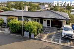 Lóðin er vel skipulögð með stóru bílaplani einnig er hiti í tröppum og stétt fyrir framan húsið.