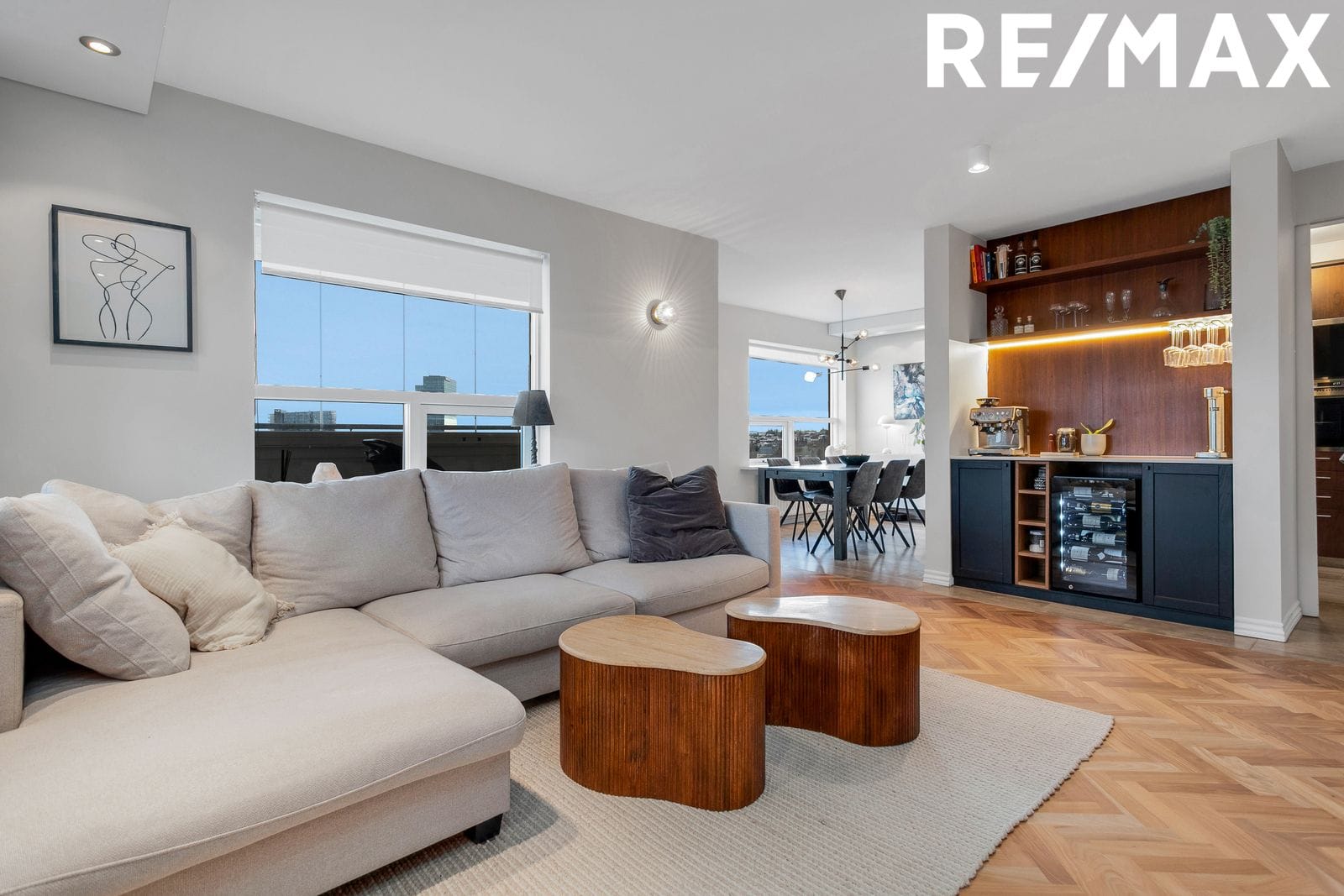 Stofa/alrými: mjög rúmgott og bjart stofurými með gluggum í suður/vestur og fallegu útsýni. Innbyggðar hillur úr hnotu, hannaðar af Rut Kára ásamt niðurtekinni lýsingu. Niðurlímt síldarbeina-parket flæðir um alrými og inn í svefnherbergin. Virkilega smekklegur kaffi/vínbar hefur verið settur upp í stofurýmið með led lýsingu og stein á borði.