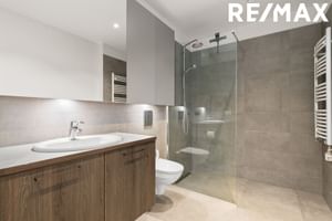 Baðherbergi: Mjög rúmgott. Flísalagt í hólf og gólf, flisar frá Álfaborg. Innréttingar með mattri viðarklæðningu, speglaskápar á vegg fyrir ofan vask. Skápur með tengi fyrir þvottavél og þurrkara, klæddur með mattri viðarklæðningu. Walk in sturta, handklæðaofn og upphengt salerni.