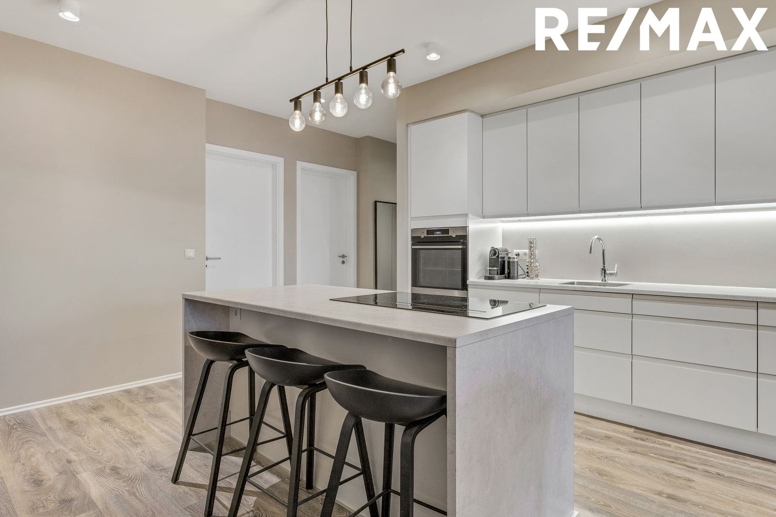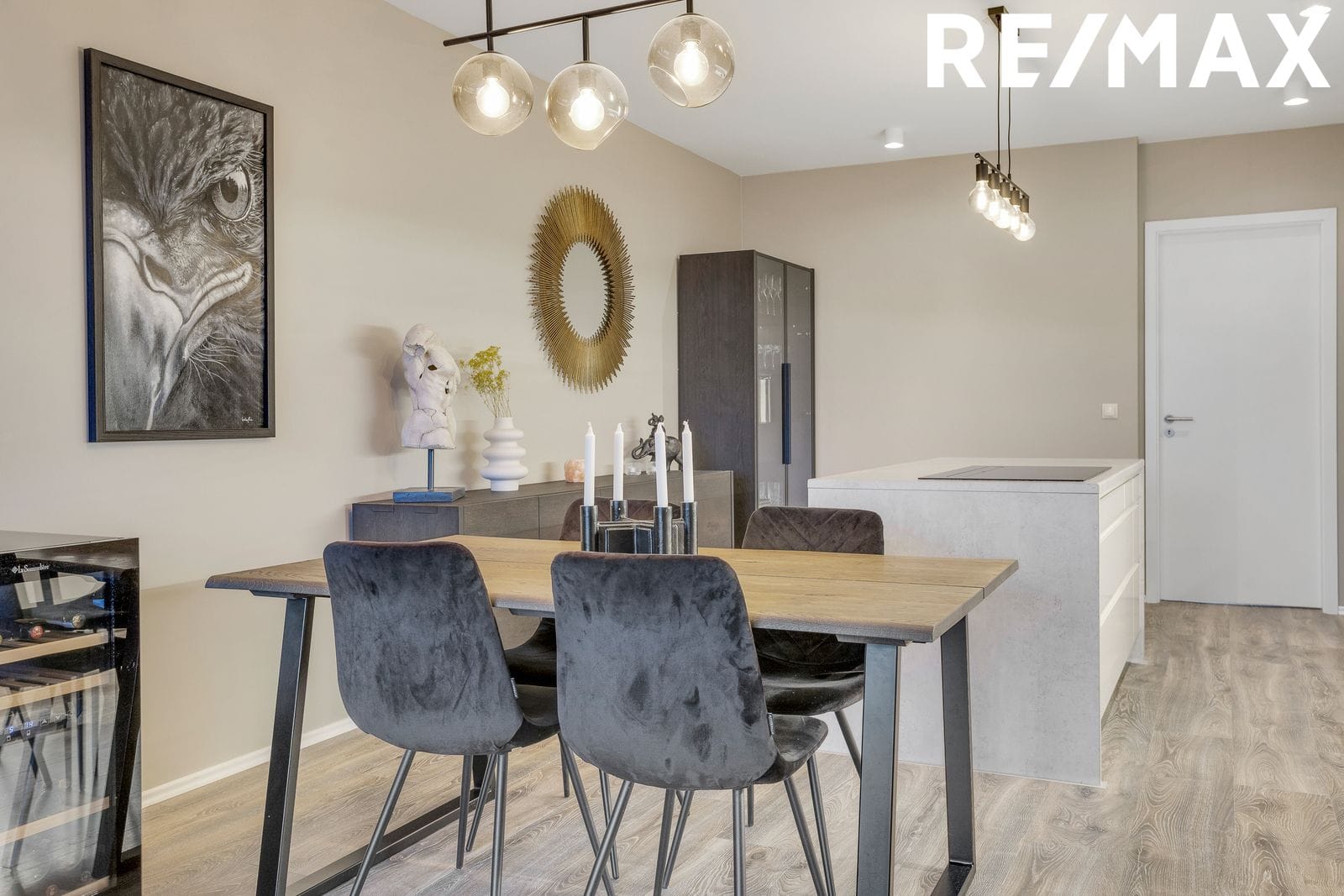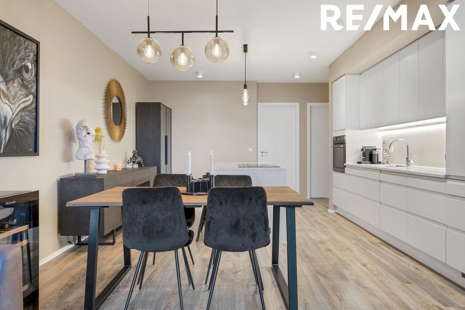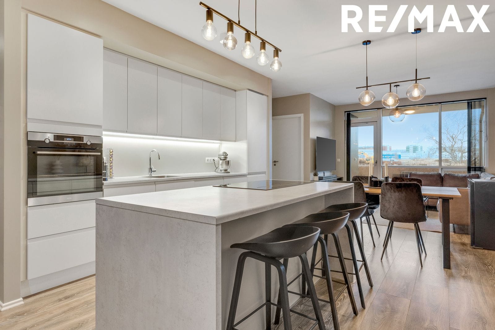 Eldhús er í glæsilegu opnu rými við borðstofu og stofu. Hvítar stílhreinar innréttingar og eldhústæki AEG frá Ormsson, ofn í vinnuhæð, innbyggður ísskápur og uppþvottavél. Í