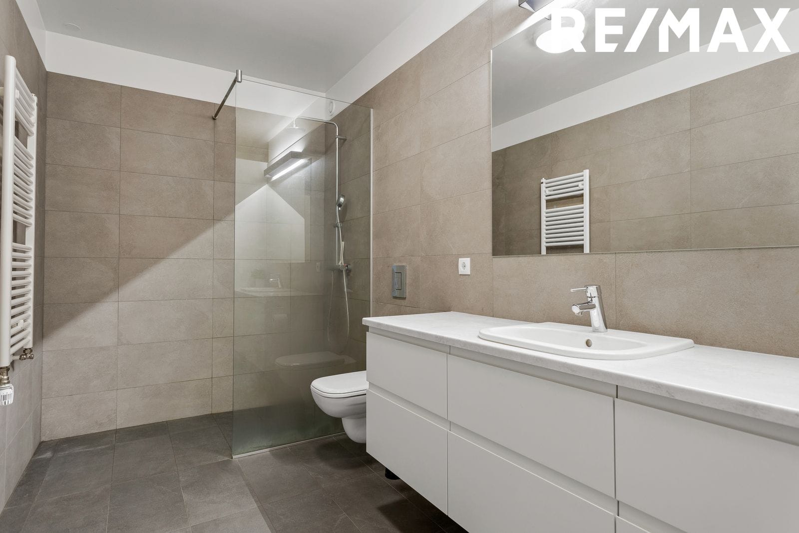 Baðherbergi er með fallegri vaskinnréttingu með góðu skúffuplássi, upphengt salerni og handklæðaofn. Sturta er með glerþili. Gólf er flísalagt og veggir að hluta.