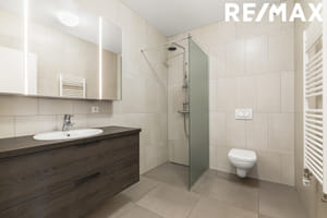 Baðherbergi: Flísalagt með upphengdu salerni, innréttingu, handklæðaofni og þreplausri sturtu með glerþili.