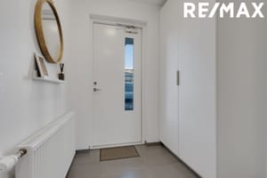 Forstofa: Komið er inn í forstofu með fallegum gráum flísum á gólfi og tvöföldum hvítum fataskáp.