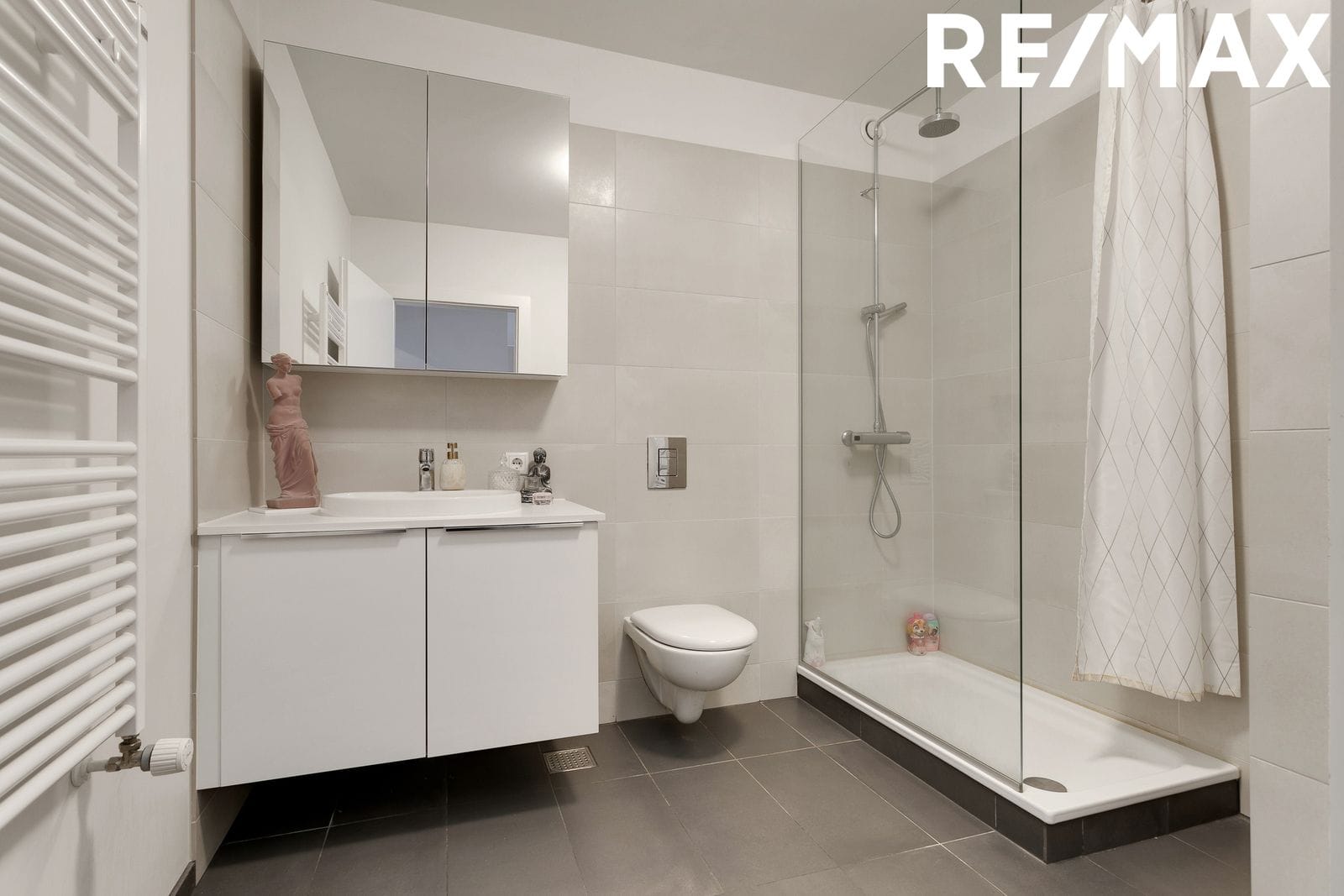 Baðherbergi: Baðherbergið er rúmgott með gráum flísum á gólfi og ljósum flísum á veggjum við votsvæði (á vegg við innréttinguna, salernið, í sturtunni og að þvottaaðstöðunni). Hvít innrétting er undir vaski og hvít borðplata, spegla skápur er á vegg fyrir ofan vaskeininguna. Góð sturta með gleri er beint á gólf og hanklæðaofn er á vegg. Hlaðinn veggur skilur á milli sturtunnar og aðstöðunnar fyrir þvottavél og þurrkara.