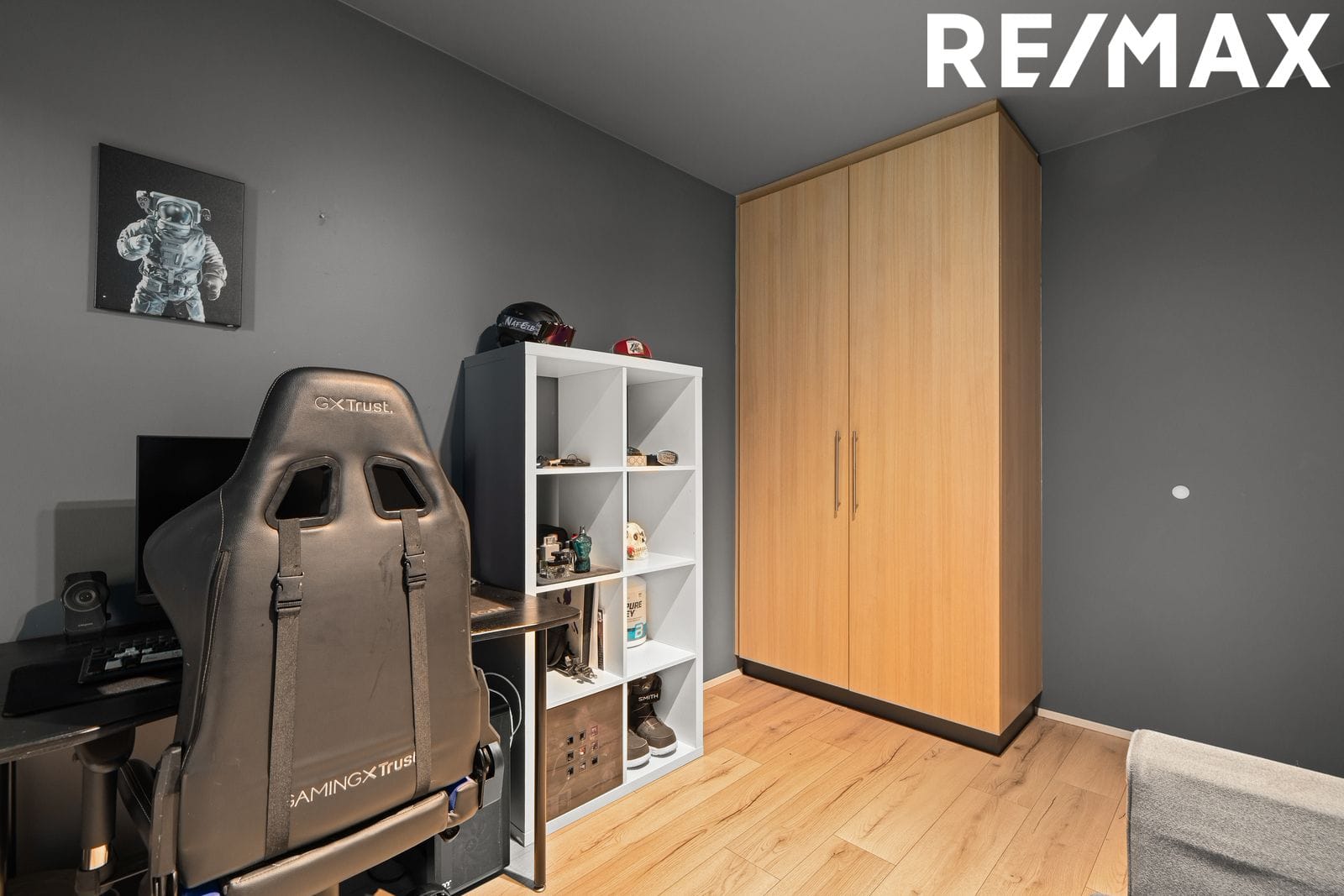 Herbergi I: Rúmgott með háum skáp og Harðparket á gólfi.