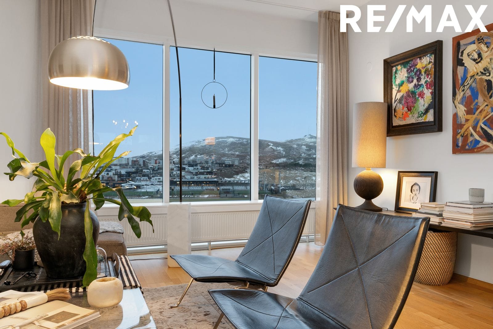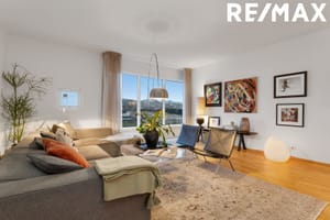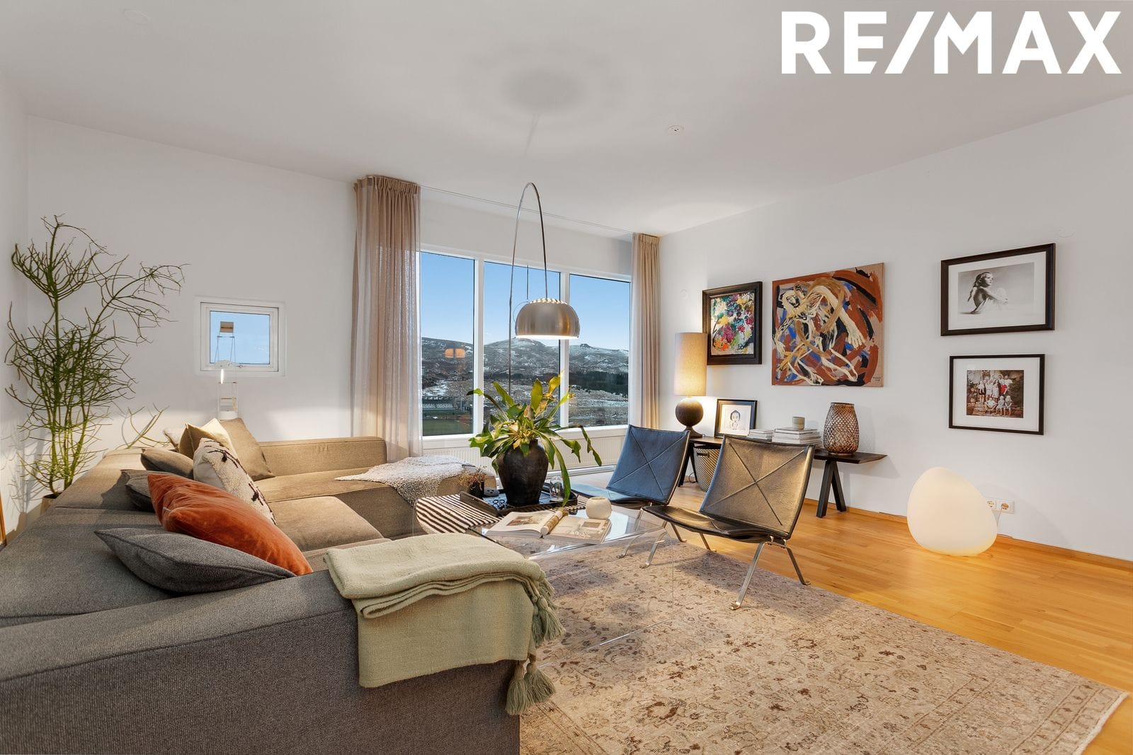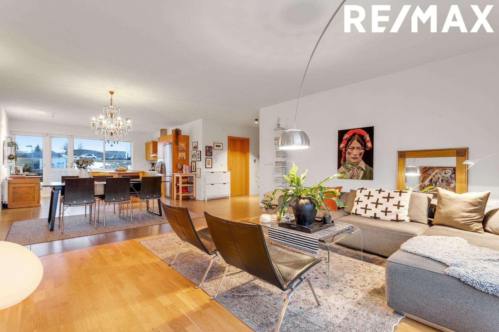 Stofa: Parket á gólfi, opin og björt með stórum gluggum og glæsilegu útsýni.