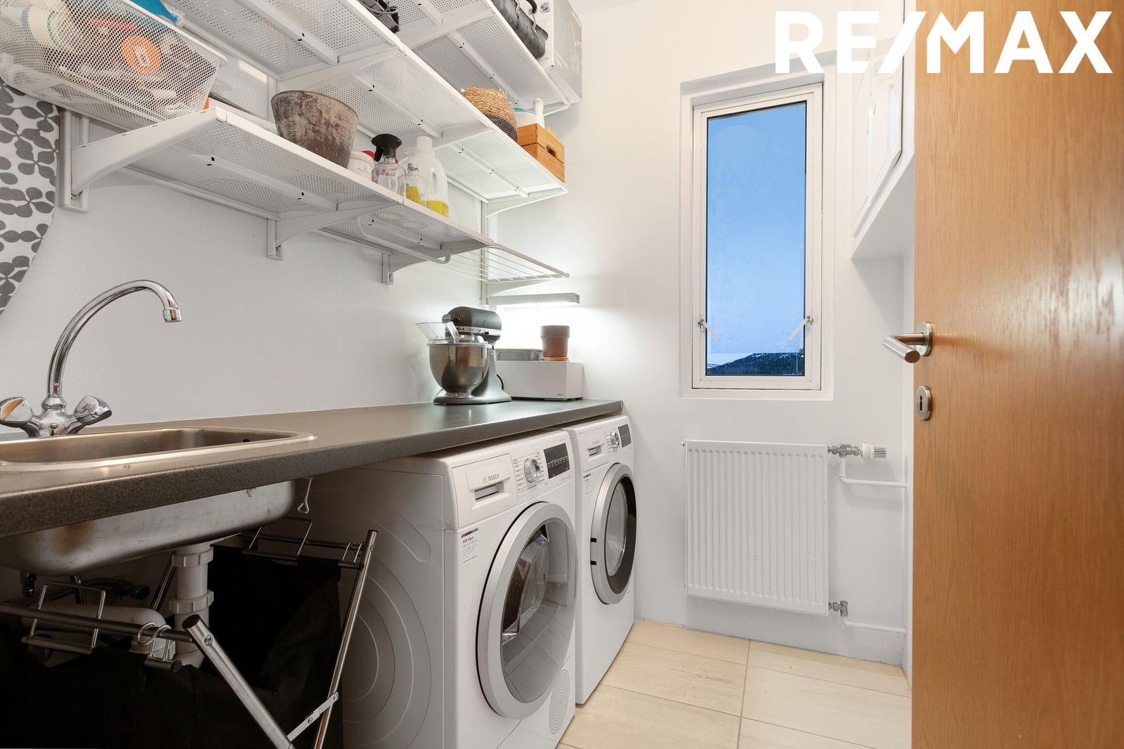Þvottahús: Innan íbúðar, flísar á gólfi, borðpláss, skolvaskur, hillur, tengi fyrir þvottavél og þurrkara, gluggi.