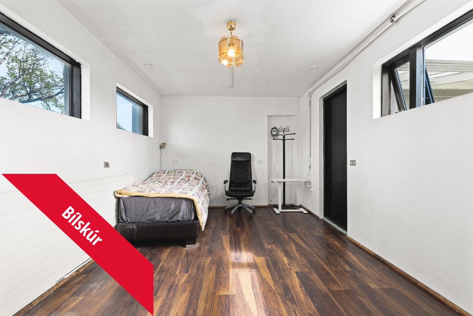 Bílskúr er með nýlegri bílskúrshurð, en inni er uppsett salerni, sturta og lítil eldhúsinnrétting. Býður upp á möguleika. Gluggar eru á tvo vegu. Parket og flísar á gólfi.