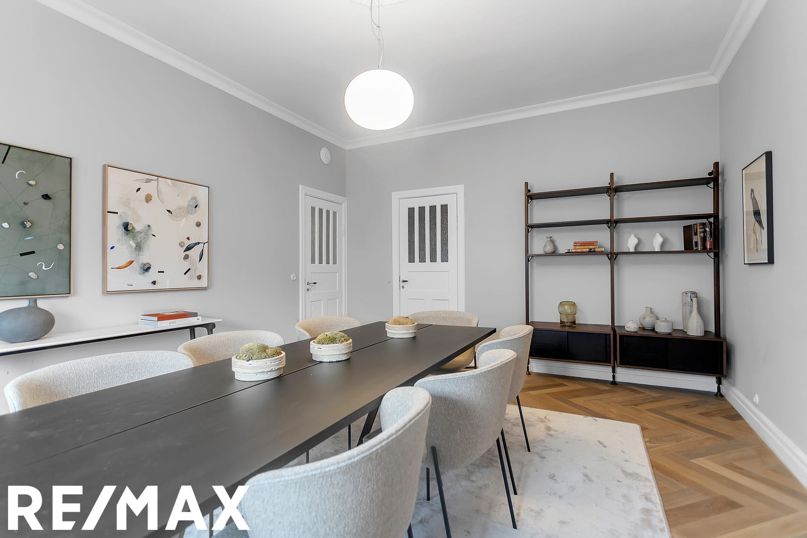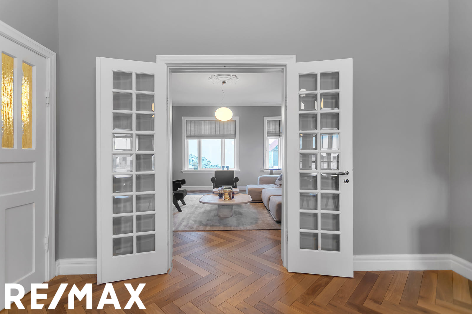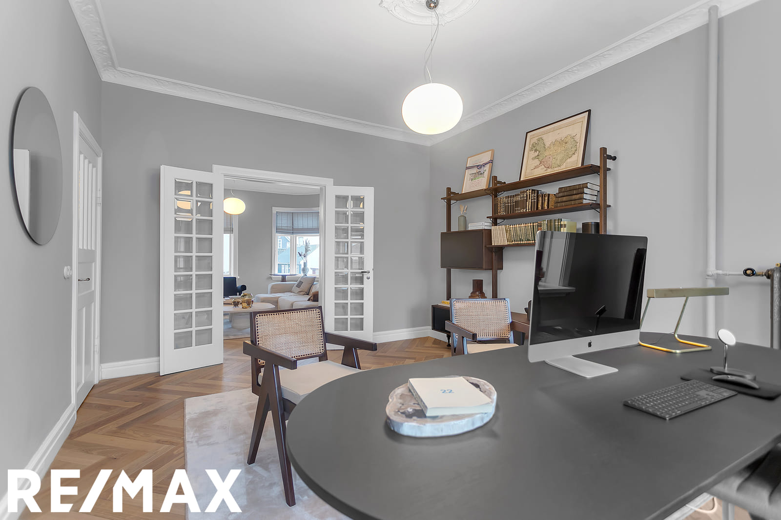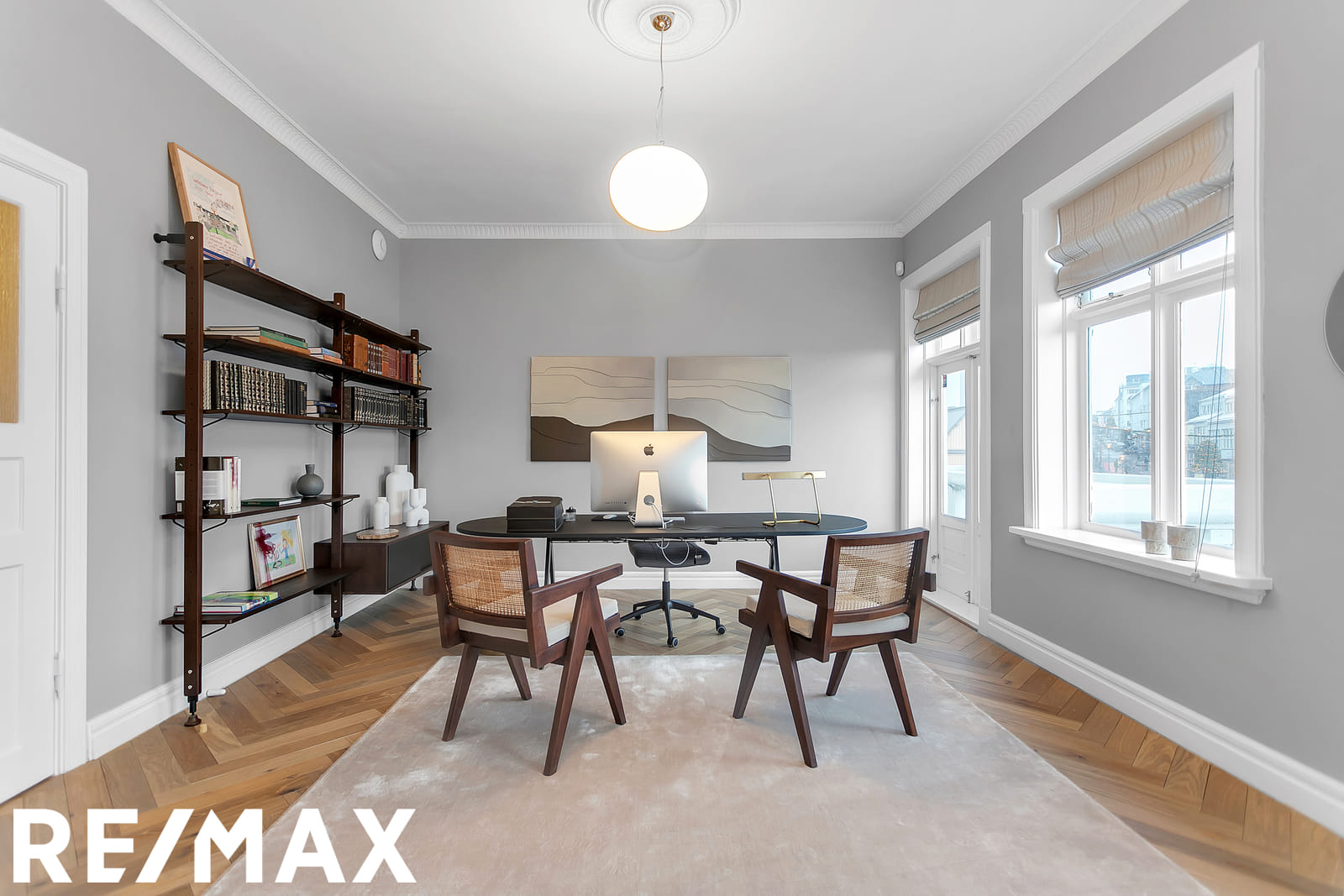 Skipulag telur: 5 skrifstofurými/ herbergi og ein stofa. Tvö baðherbergi og eitt gesta salerni. Aukin lofthæð, vönduð gólfefni og vandað eldhús. Fallegir gluggar, rósettur í lofti og kamína í stofu. Virklega smekkleg og falleg eign á flottum stað.