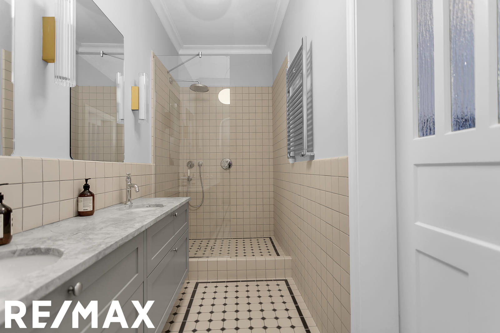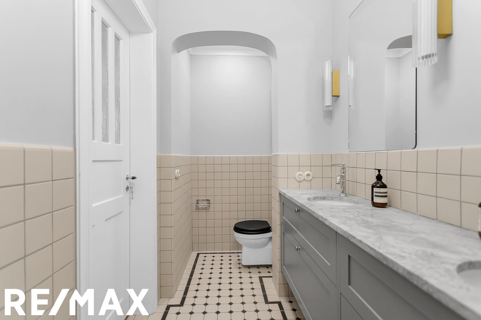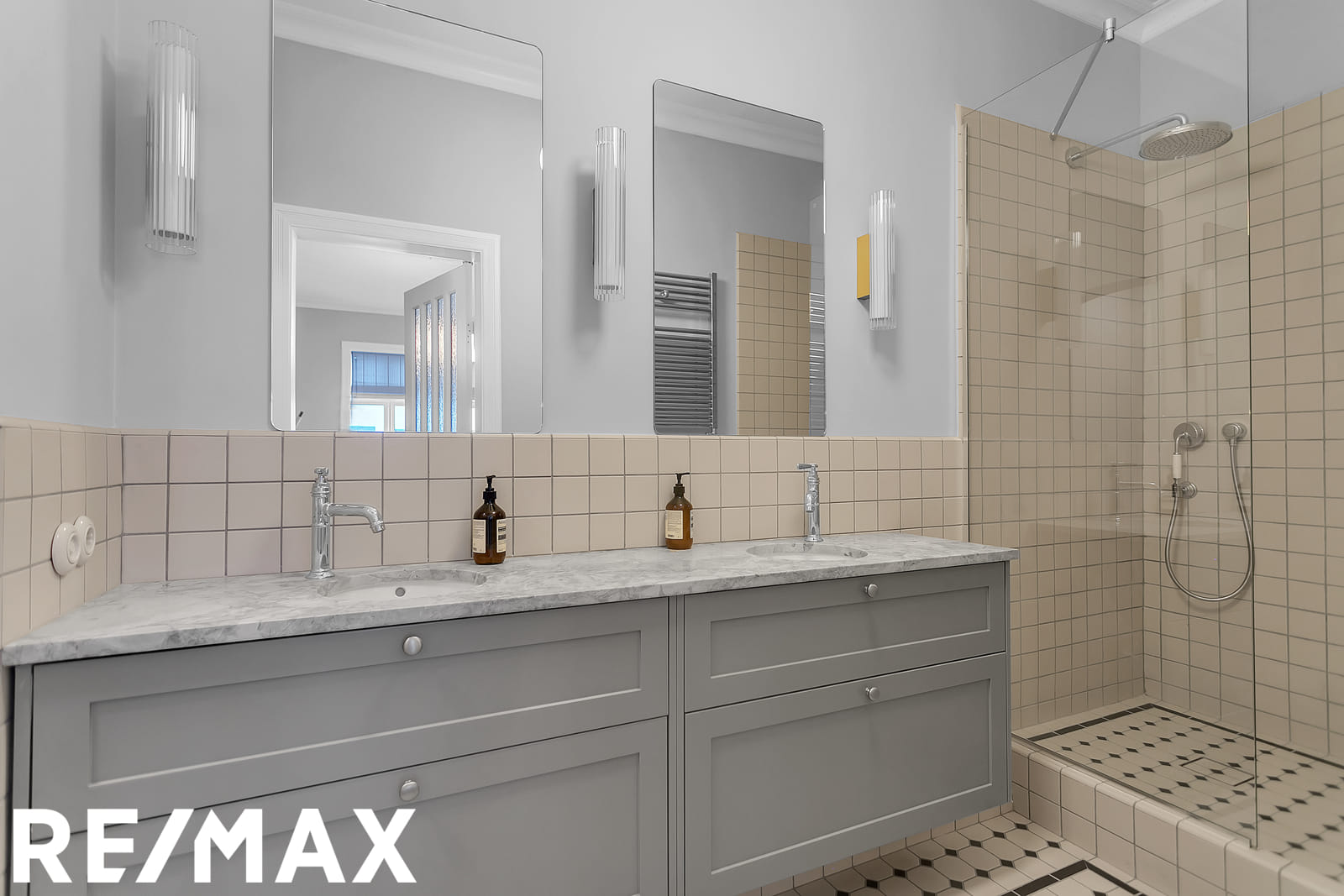 Inn af einni skrifstofunni er sér baðherbergi flísalagt að hluta. Upphengt salerni. Innrétting með tveimur undirlímdum vöskum og speglar þar fyrir ofan. Steinn á borði. Flísalögð sturta með innbyggðum blöndunartækjum, glerskilrúm og handklæðaofn.